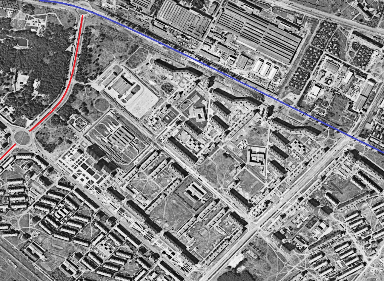 Взглянем на спутниковый снимок от августа 1978 года. На нем видно, что 10-й и 11-й микрорайоны уже плотно застроены, за исключением их западных оконечностей, примыкающих к улице XXII Партсъезда (красная линия).