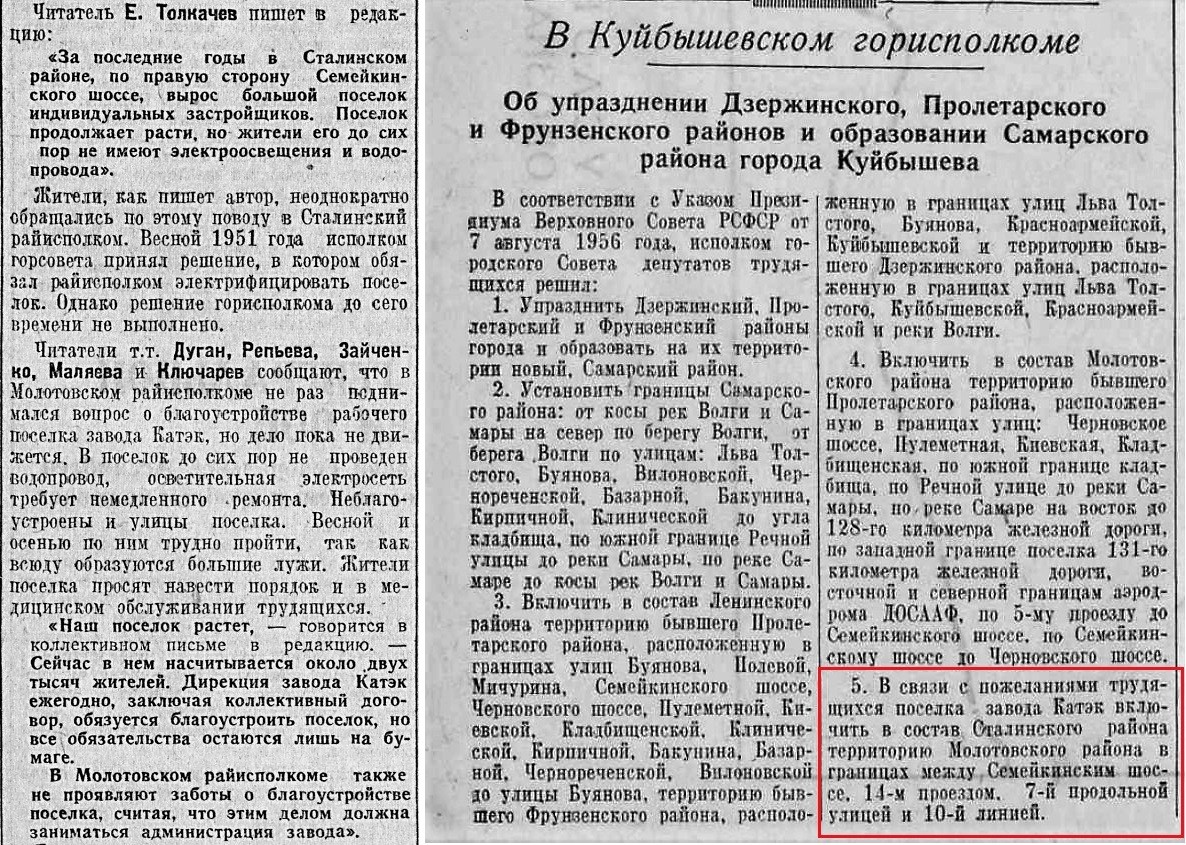 Дополнительные проблемы создавало то, что поселок находился в Молотовском (Советском) районе, в то время как сам КАТЭК и весь заводской соцкультбыт — в Сталинском (Октябрьском). В 1956 году границы были изменены.