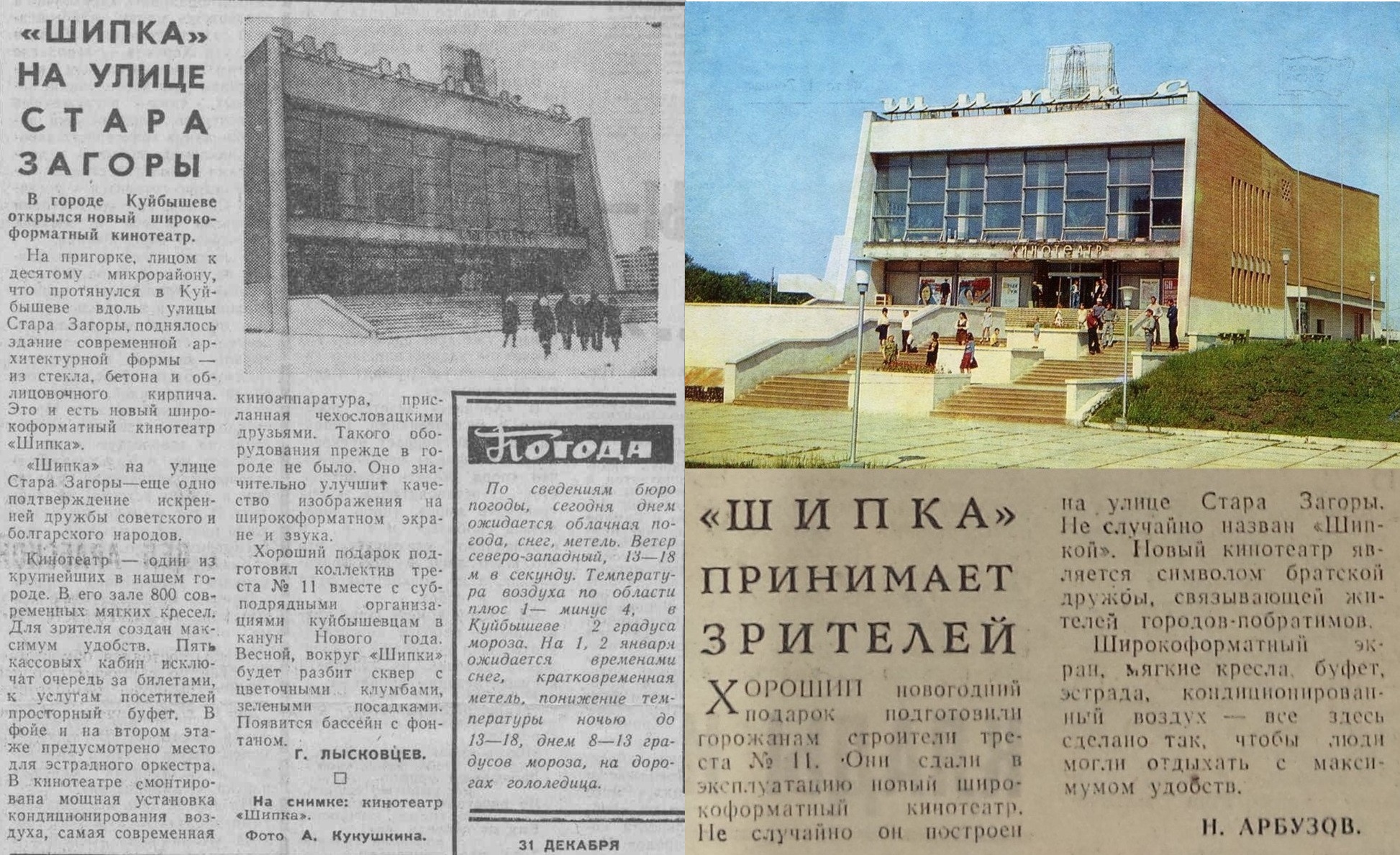 Февраль 1971 года.Однако в том же 1972 году свой «Сатурн» открылся в Автозаводском районе Тольятти (Революционная, 9). Видимо, чтобы не повторяться, кинотеатру на улице Стара-Загора было решено дать другое, более «болгарское» название — «Шипка».
