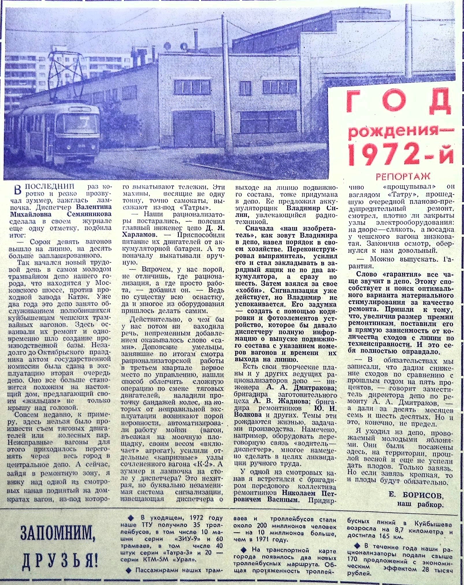 29 декабря 1969 года первая очередь Северного трамвайного депо была принята в эксплуатацию. Полностью же его достроили лишь спустя три года. Вот праздничный репортаж об этом событии из газеты ТТУ «За регулярный рейс».