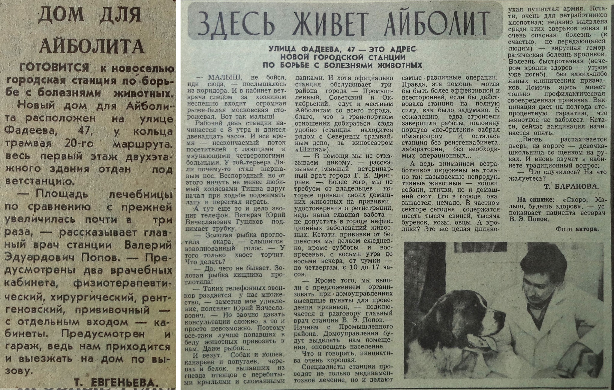 Спустя пять лет соседями защитников городской флоры стали врачеватели фауны. В 1987 году в здание с адресом Фадеева, 47 заселилась Городская станция по борьбе с болезнями животных.