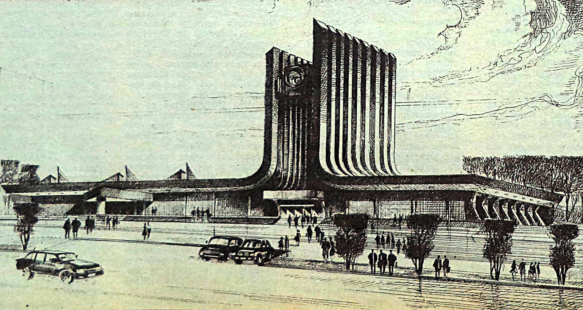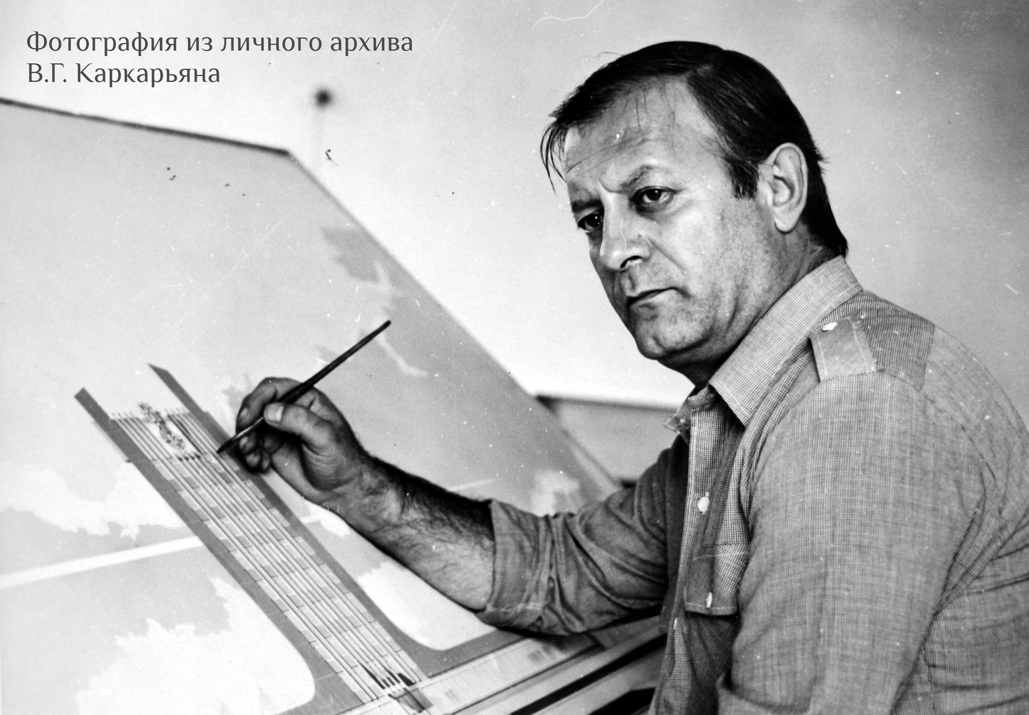Прежде всего привлекает внимание здание ЦАВС, то есть городского аэровокзала. Проект этого масштабного сооружения разработал архитектор Каркарьян. На фотографии из личного архива Вагана Гайковича он как раз работает над внешним видом этого здания.