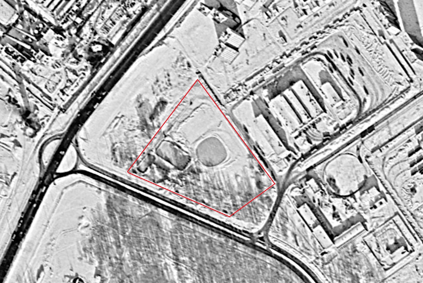 На спутниковом снимке 1984 года можно разглядеть два футбольных поля, а правее от них — трассу для спидвея.