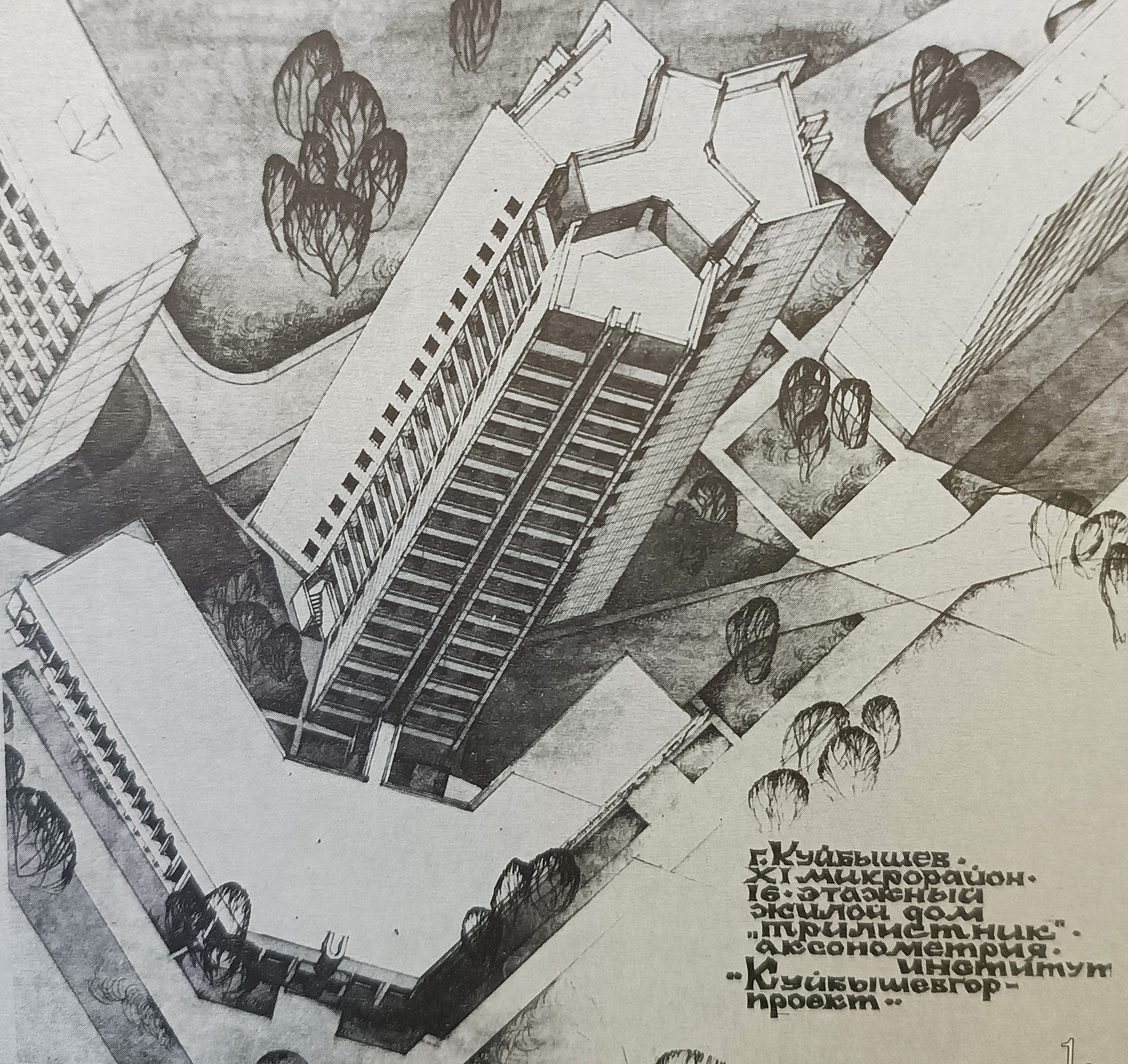По проекту 1965 года здесь должны были стоять типовые панельные дома. Но, видимо, потом было решено украсить этот перекресток архитектурной доминантой. Работавший в Куйбышевгорпроекте архитектор Владимир Антончев хотел видеть здесь свой авторский «Трилистник». Проект этого дома он разработал в 1978 году.