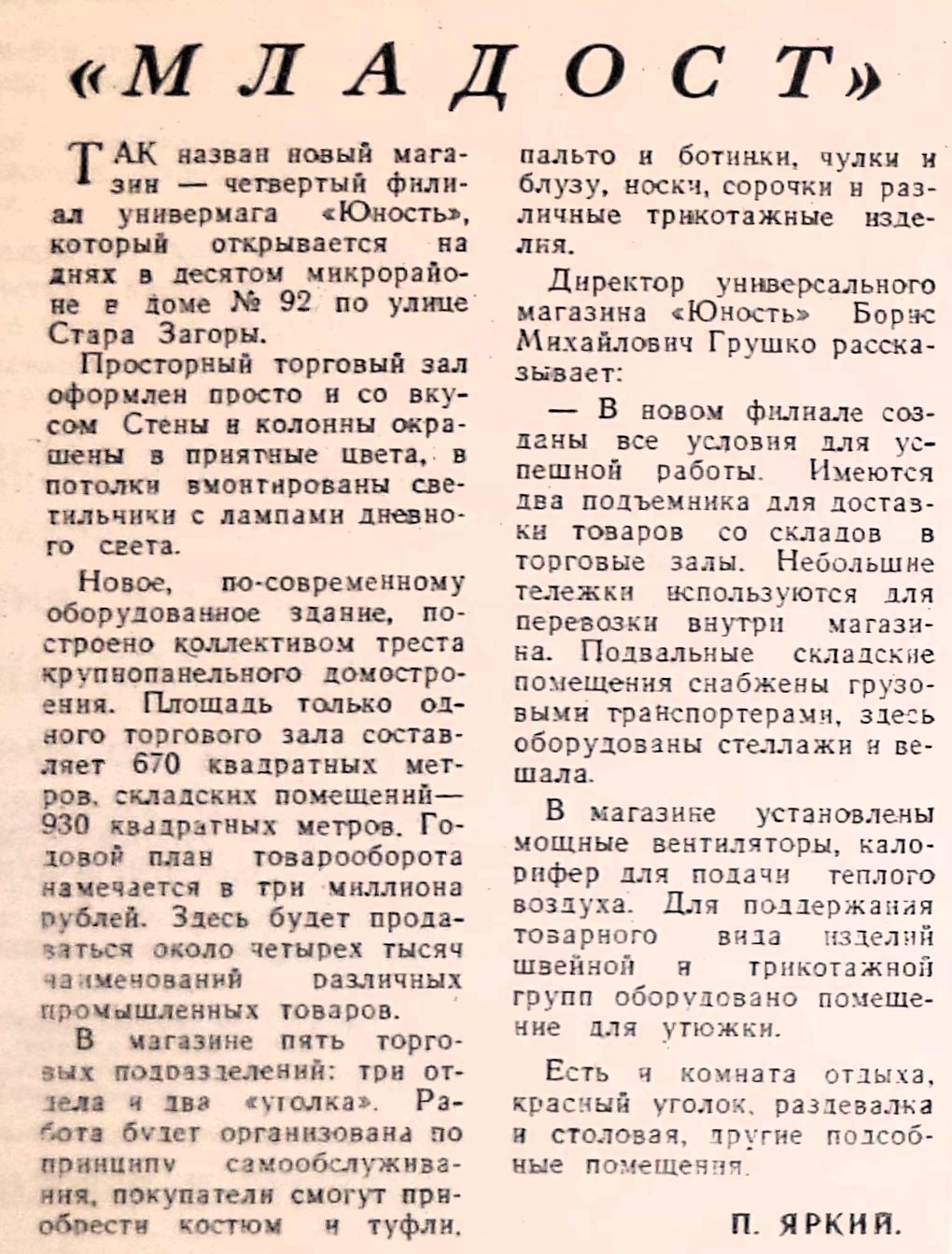 Первые этажи примыкающих к бульвару домов отдали под размещение магазинов, самым известным из которых был промтоварный магазин с болгарским названием «Младост» (Стара-Загора, 92).
