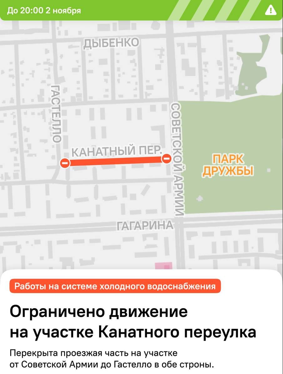 Также до 20:00 2 ноября будет закрыт для движения транспорта Канатный переулок от улицы Советской Армии до улицы Гастелло.