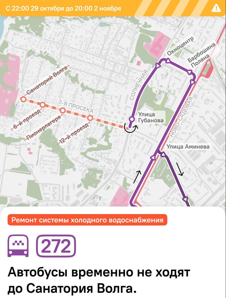 Маршрутки № 272 на время ограничений будут ходить по укороченной схеме: разворачиваться в районе остановки «Улица Губанова», не доезжая до санатория «Волга». Посадка и высадка будет осуществляться на остановке «Улица Губанова» по улице Солнечной.