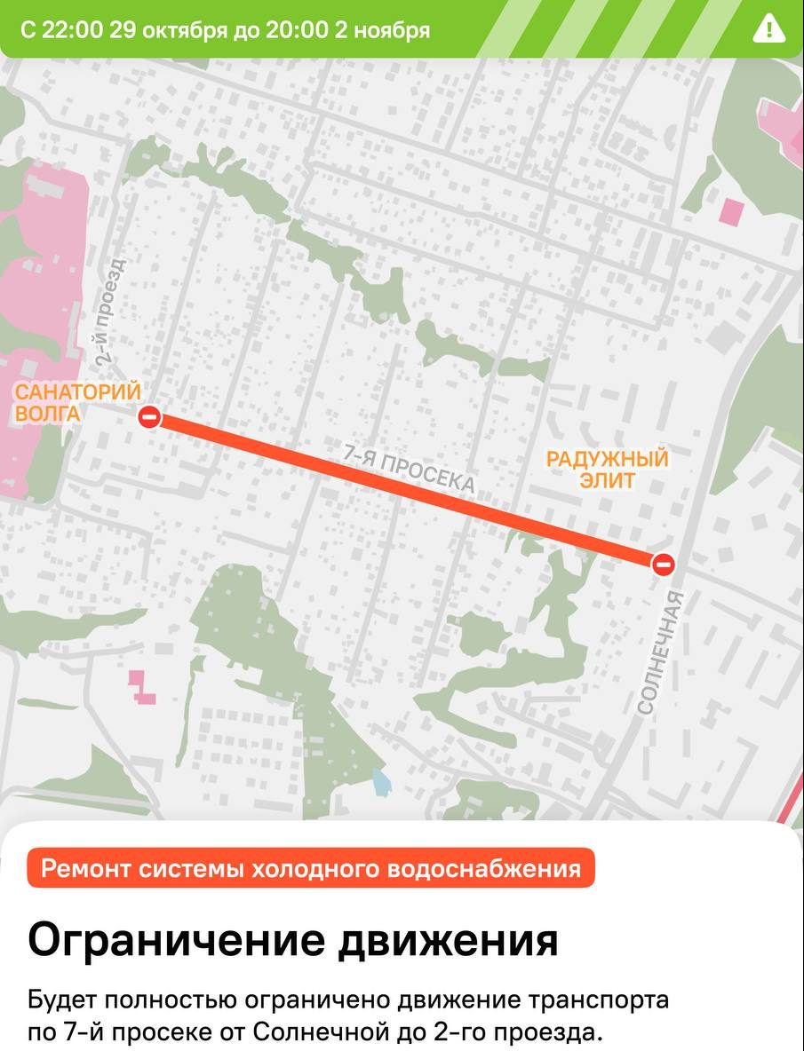 С 22:00 29 октября до 20:00 2 ноября будет полностью перекрыто движение транспорта по Седьмой просеке на участке от улицы Солнечной до 2-го проезда Седьмой просеки.