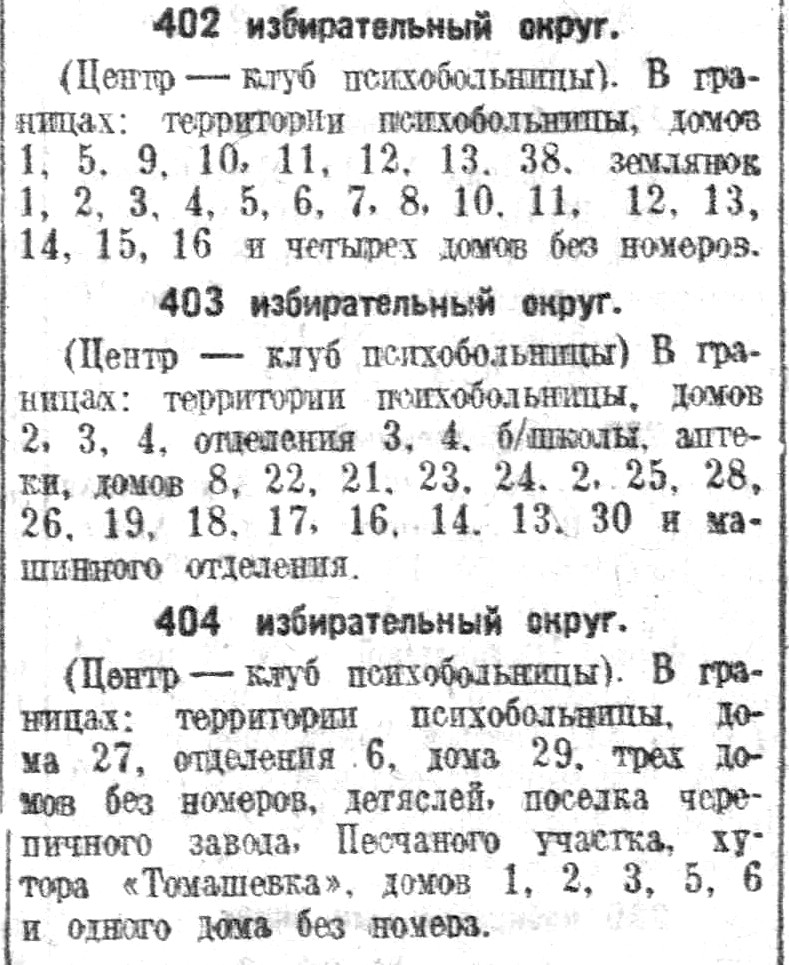 Обратимся к спискам избирательных округов. Так, в 1939 году жители Томашева Колка голосовали аж на трех избирательных участках, располагавшихся в клубе психбольницы.