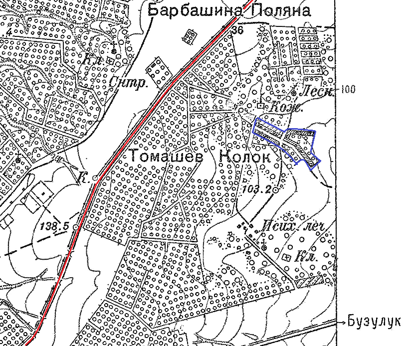 На карте середины 1920-х годов мы отметили поселок Томашев Колок синим контуром, а Московское шоссе — красной линией.