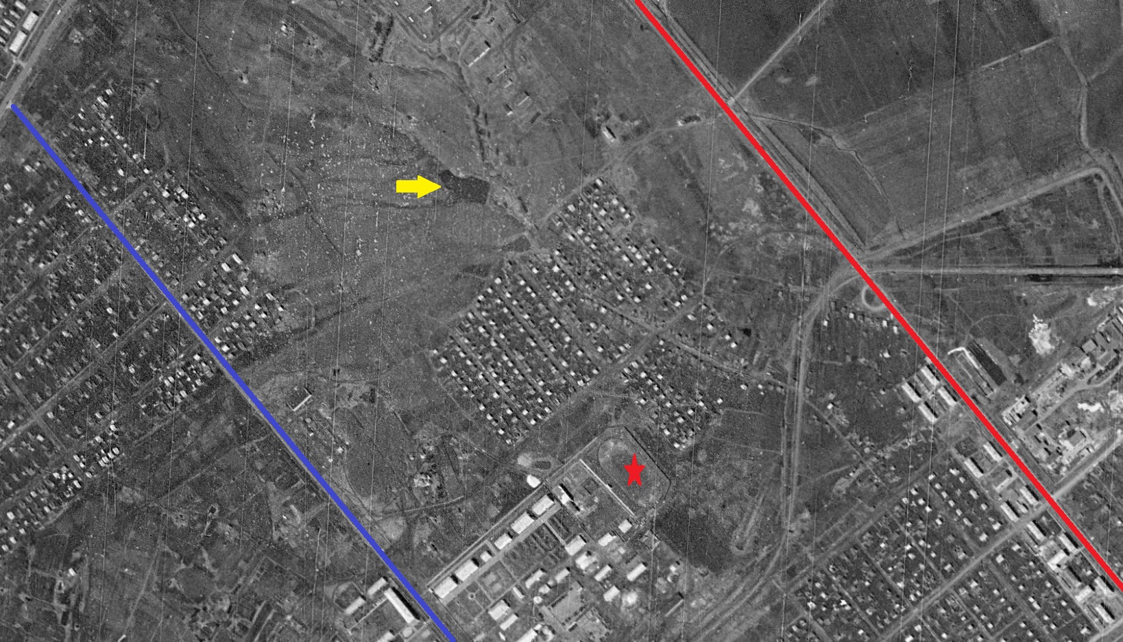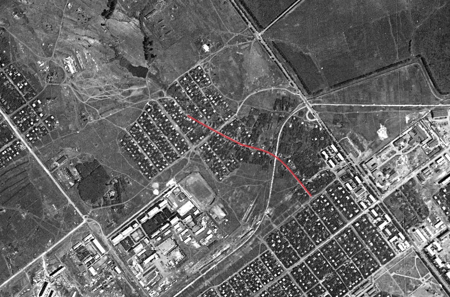 Чтобы понять, где он находился, посмотрите на спутниковый снимок Куйбышева 1965 года. На нем отмечены: