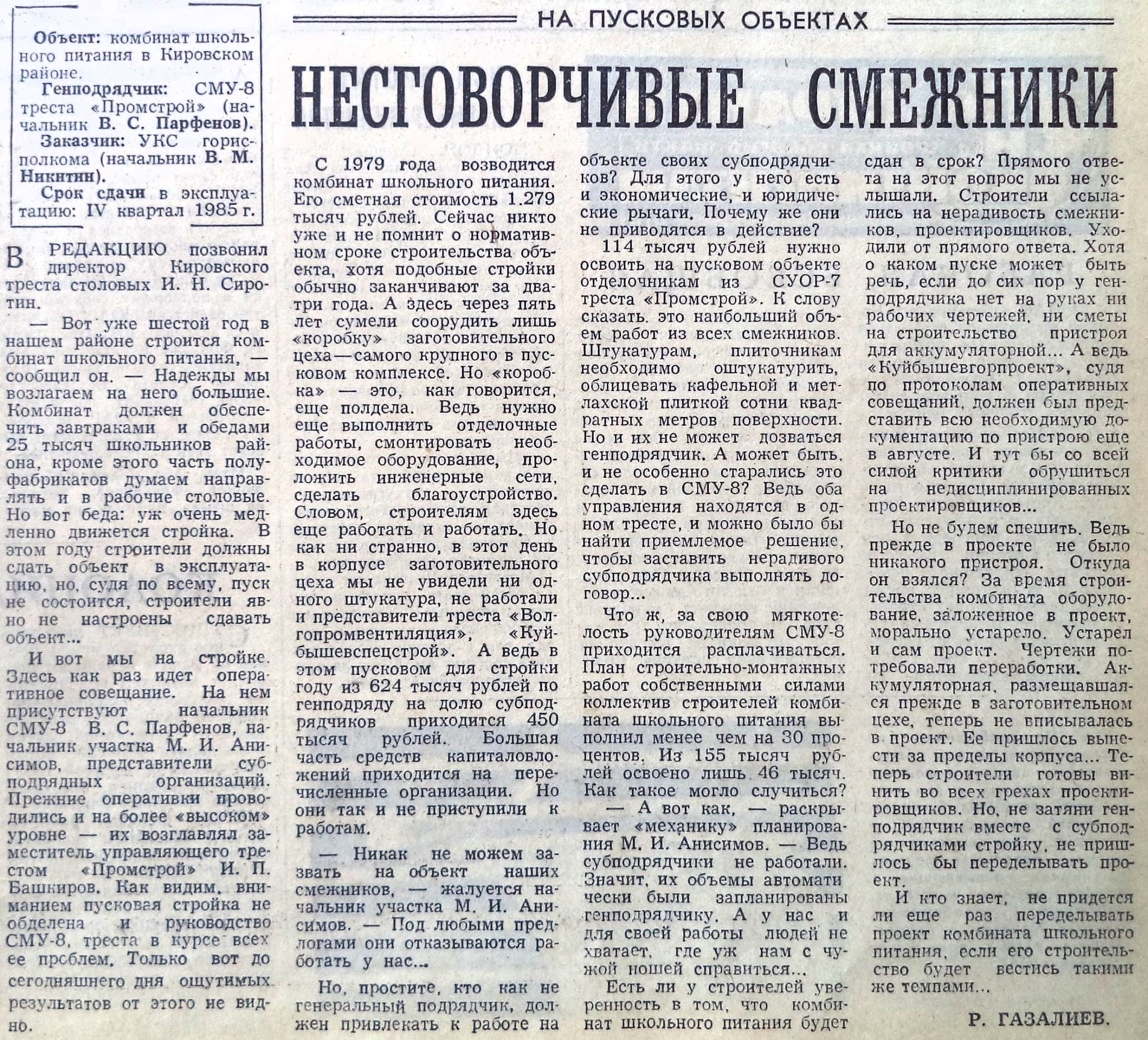 Имелся здесь и долгострой — комбинат школьного питания Кировского района. Большую статью об этом проблемном объекте опубликовала в октябре 1985 года газета «Волжская заря».