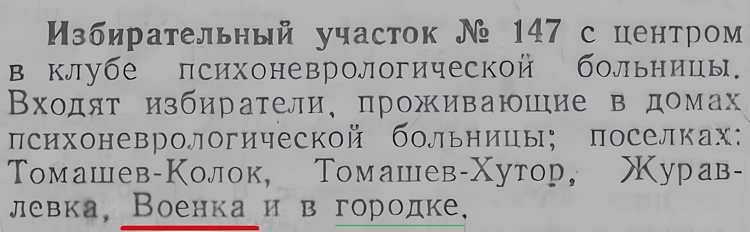 Судя по спискам избирательных округов за январь 1954 года, вблизи Томашева Колка существовал поселок с говорящим названием Военка, а также некий «городок», видимо, тоже имевший отношение к Вооруженным Силам.