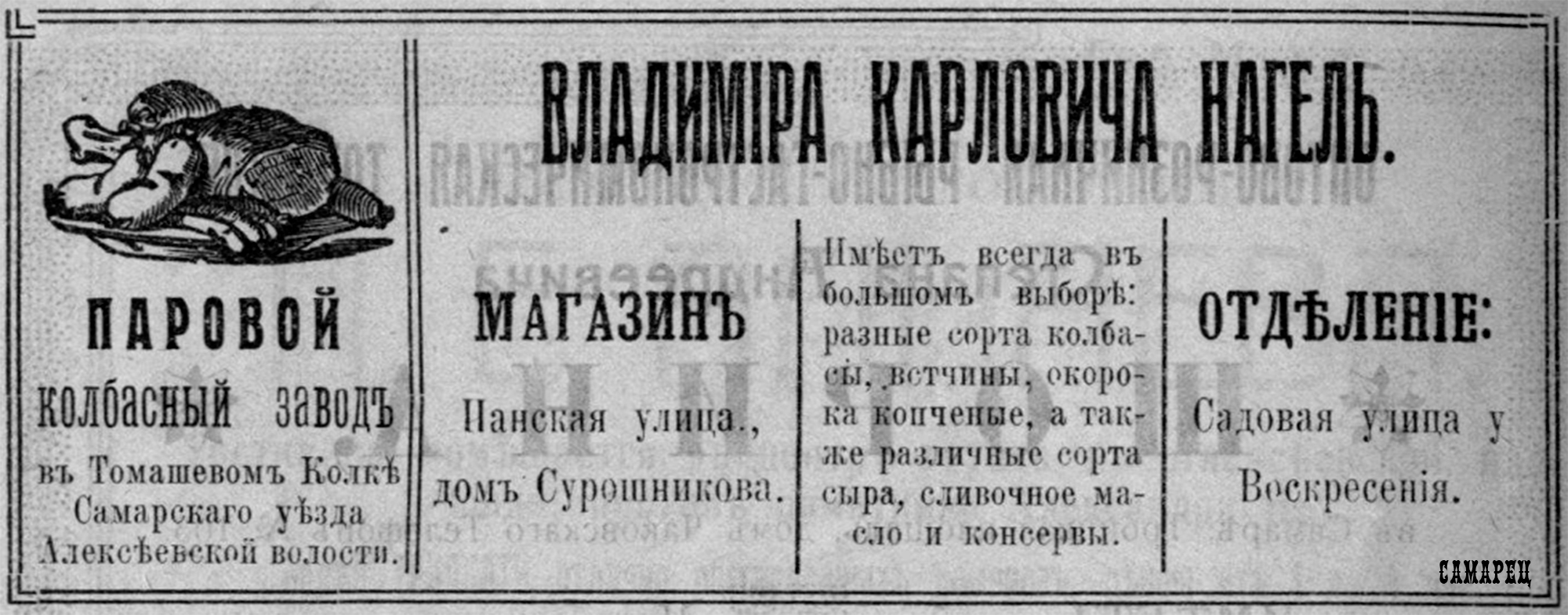 А вот с колбасным заводом господина Нагеля ситуация обратная. На картах он не отмечен, зато с четкой географической привязкой рекламировался в Памятной книжке Самарской губернии за 1913 год.