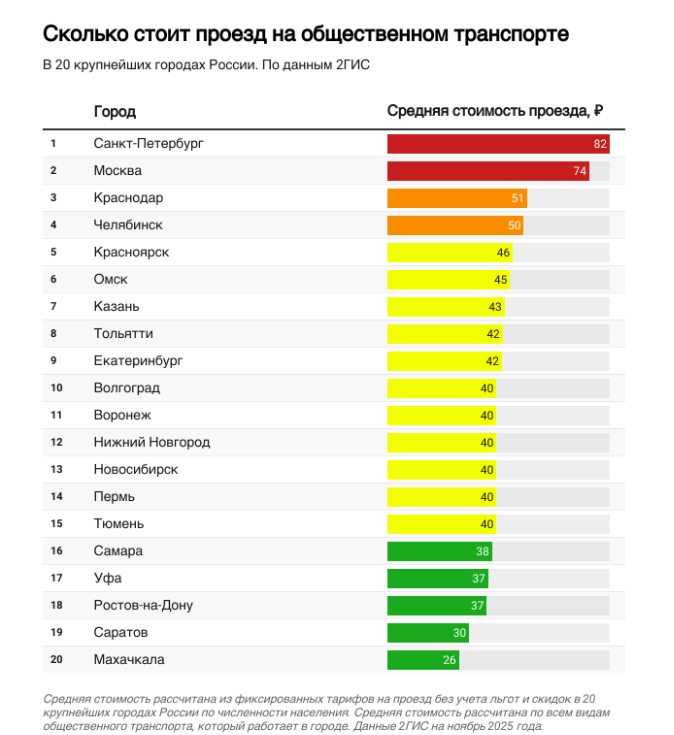 Аналитики сервиса рассчитали среднюю стоимость проезда на общественном транспорте по фиксированным тарифам и сравнили по этому показателю 20 крупнейших городов страны.