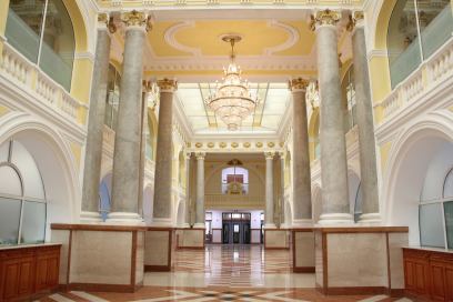 «Здесь сохранился стеклянный световой фонарь, который обеспечивает естественное освещение зала. На экскурсии посетителям банка расскажут об интересной традиции, связанной с портретами российской императорской четы.