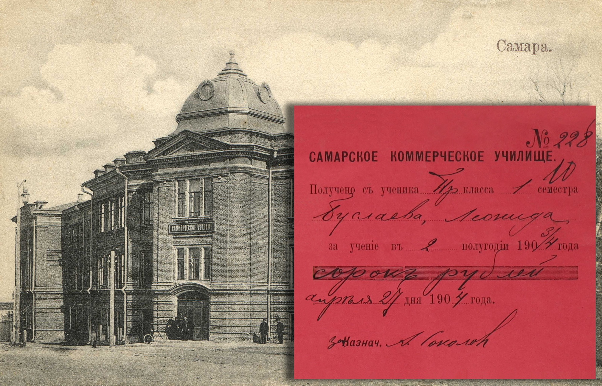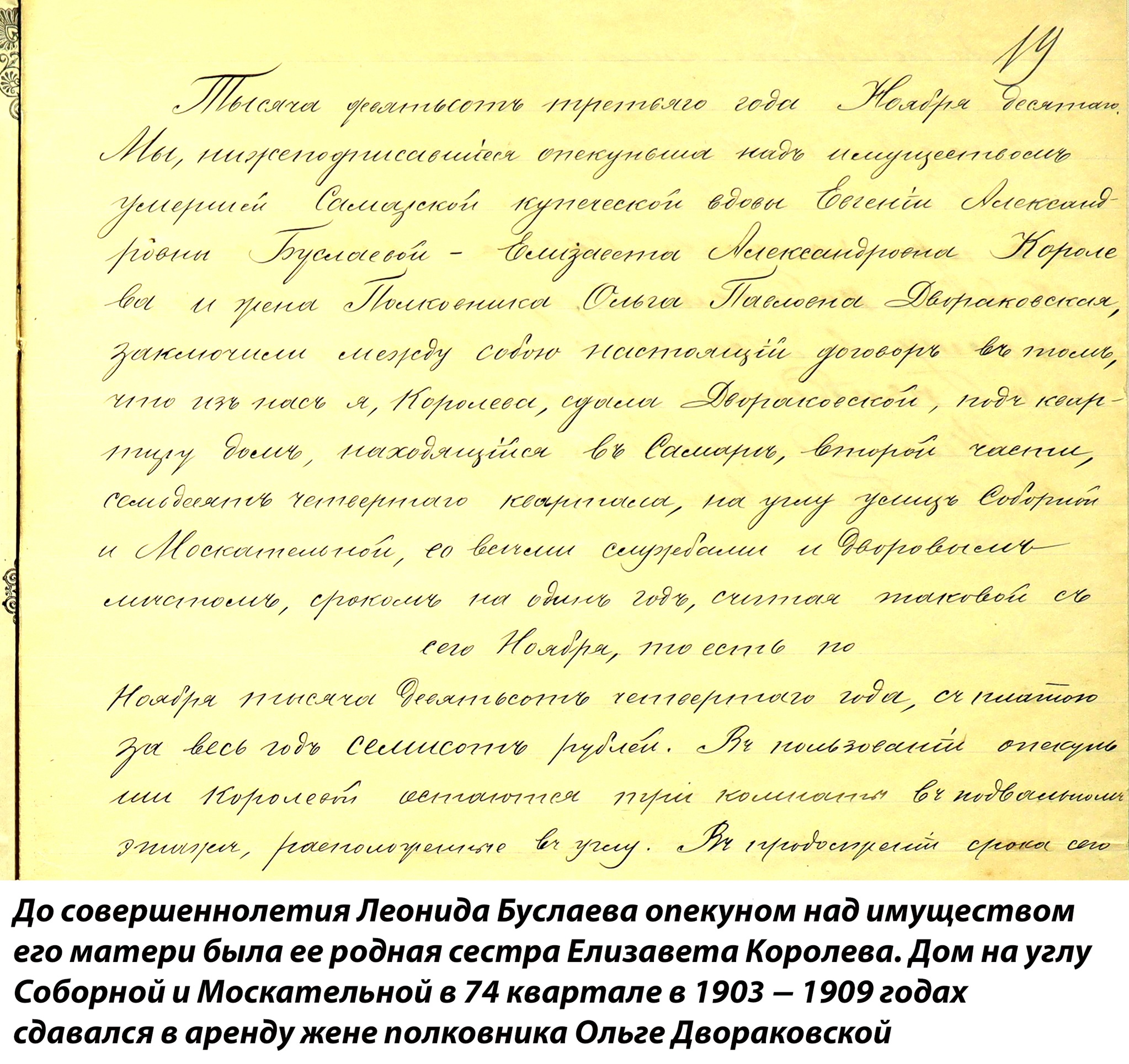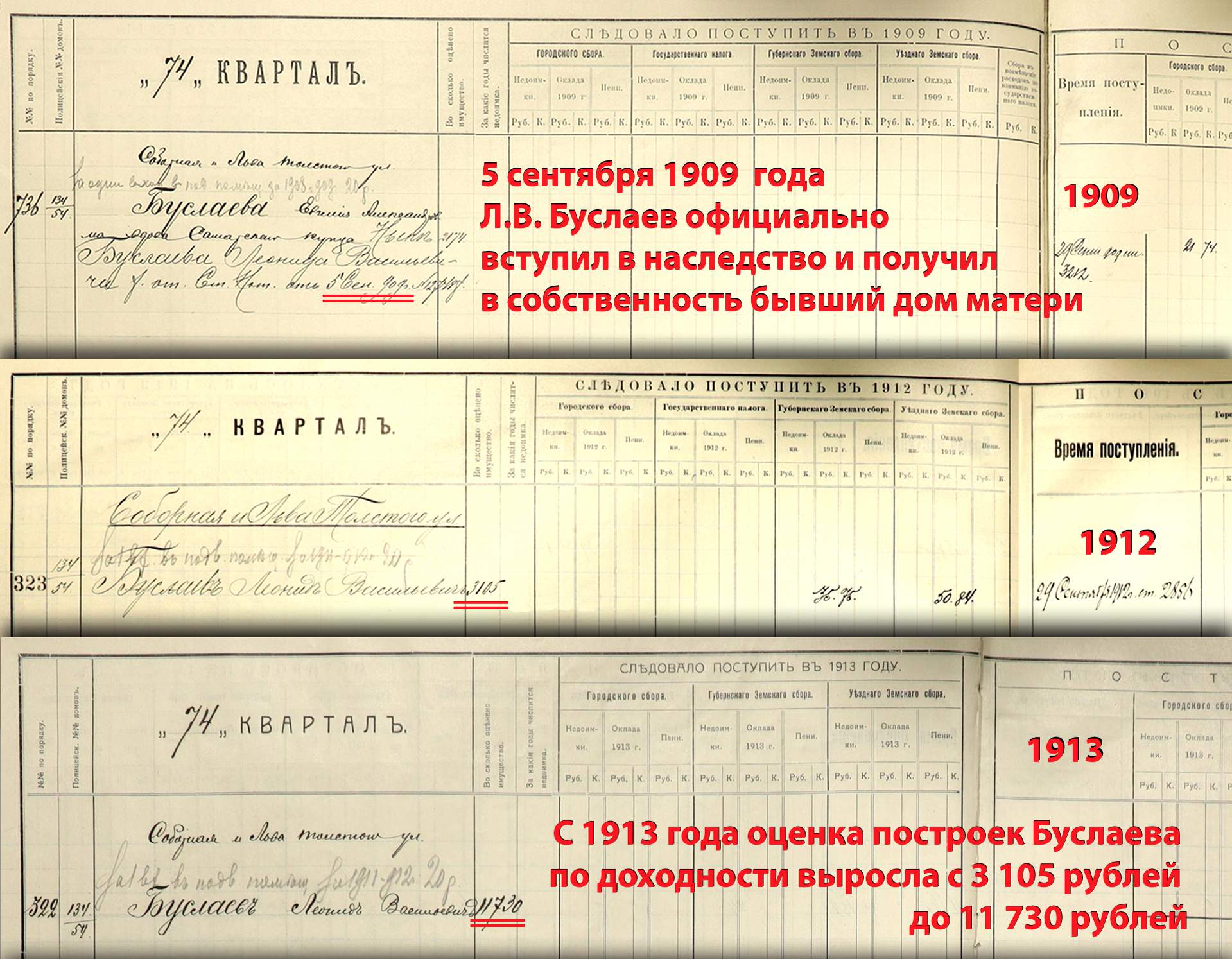 Согласно отношению нотариуса Самарского Окружного суда, 5 сентября 1909 года Леонид Буслаев вступил в наследство и принял в собственность от опекуна Е.А. Королевой двухэтажный каменный дом матери на углу Соборной и Льва Толстого в 74 квартале.