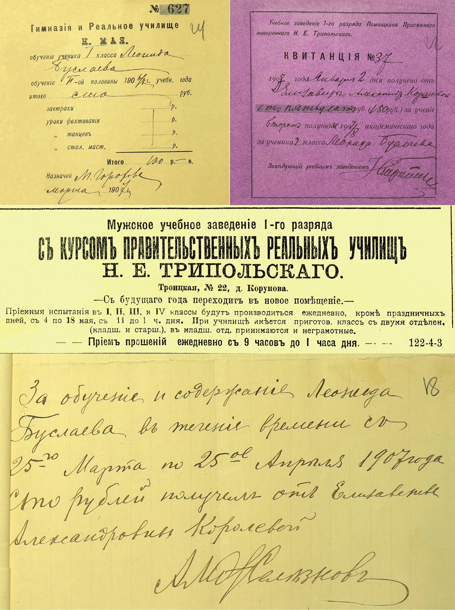 Последней попыткой получить достойное образование стало поступление Леонида Васильевича в Мужское учебное заведение 1-го разряда с курсом правительственных реальных училищ помощника присяжного поверенного Н.Е. Трипольского. Оно располагалось в доме владельца самой первой кондитерской фабрики в Самаре, унтер-офицера в отставке И.П. Корунова на Троицкой, 22 (ныне Галактионовская, 24 – 26).