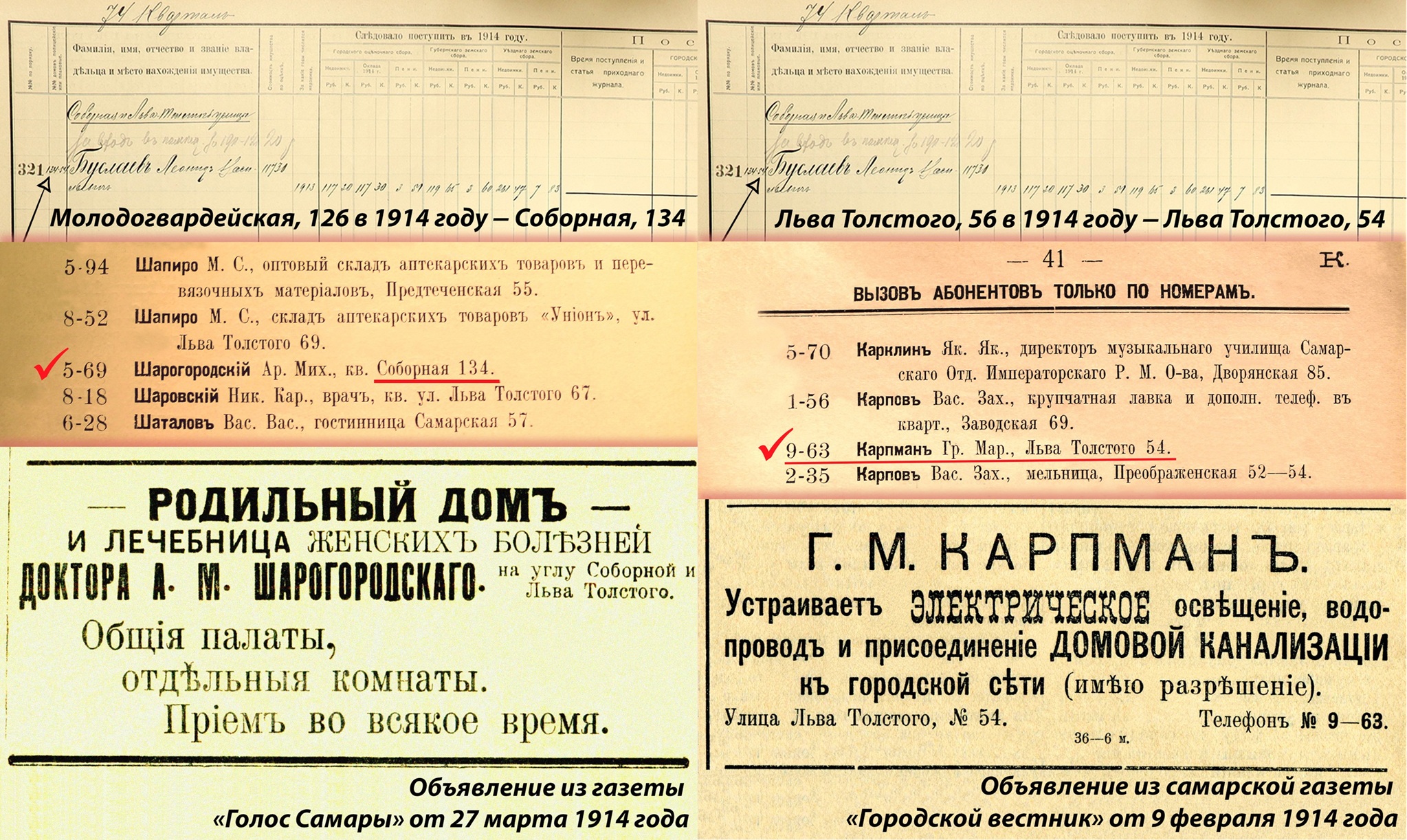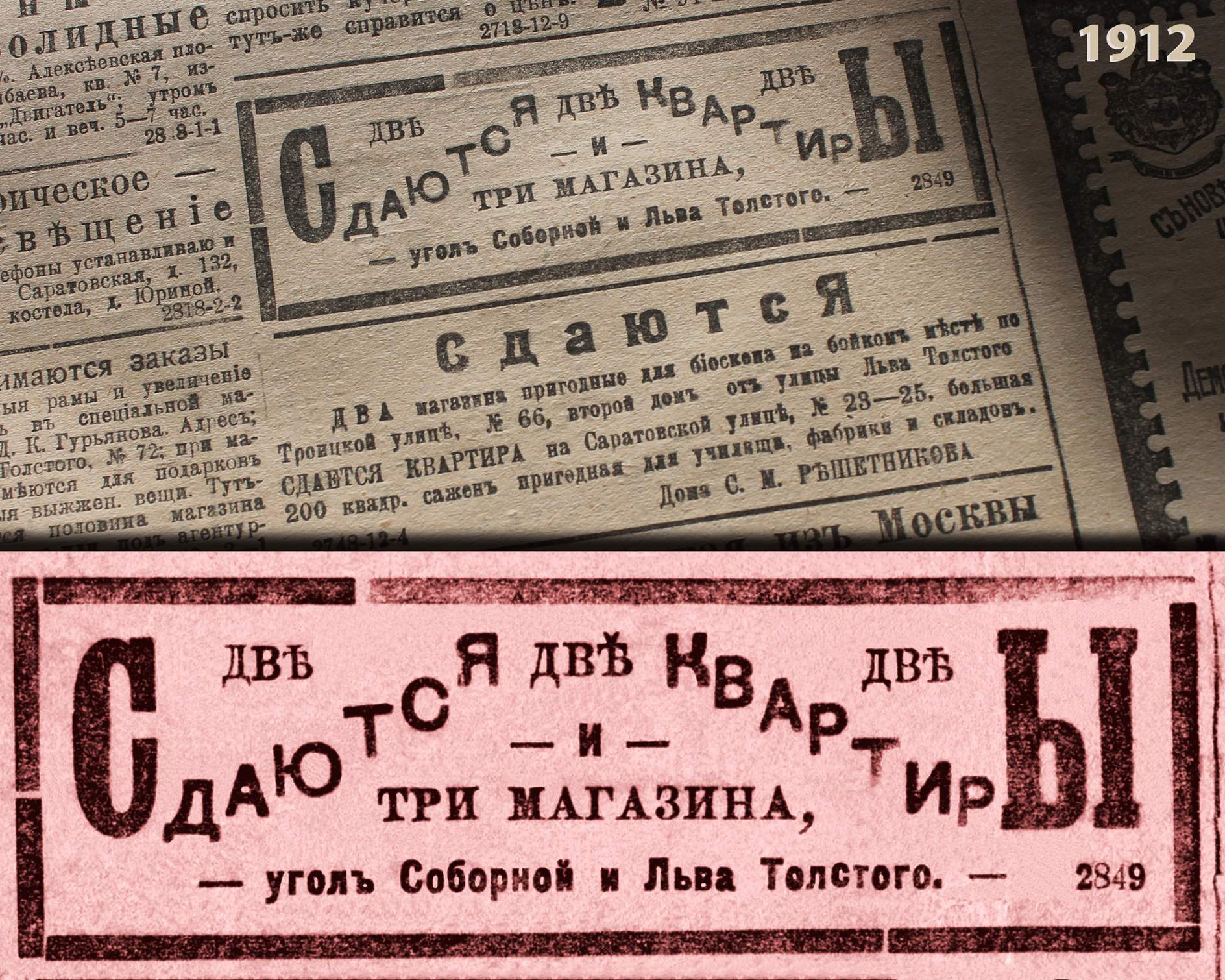 11 ноября 1912 года в газете «Волжское слово» вышло объявление о сдаче трех магазинов и двух квартир на углу Соборной и Льва Толстого.