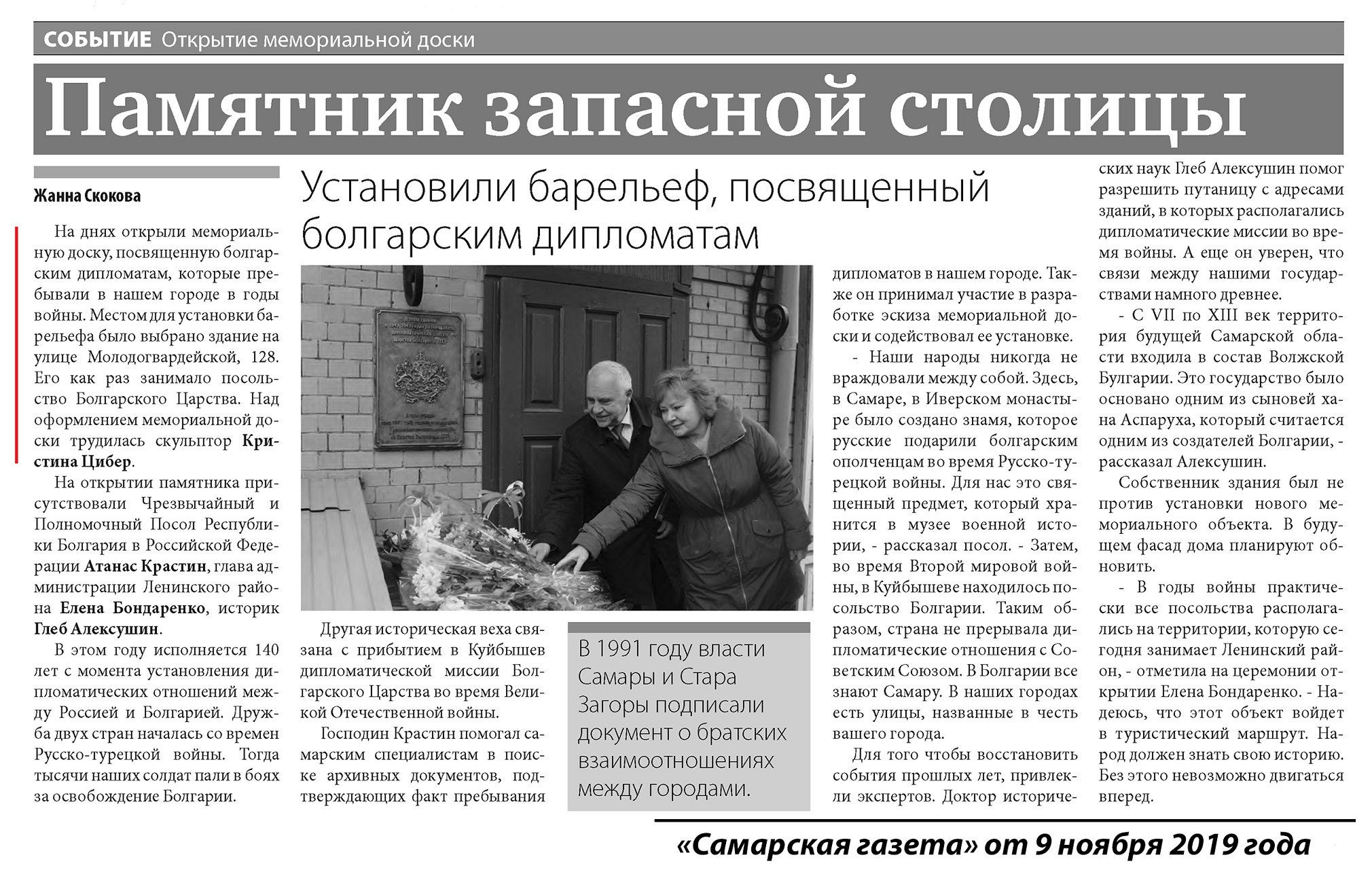 В середине 2010-х годов адреса посольств и миссий в Куйбышеве уточнили. Теперь принято считать, что миссия Болгарского царства занимала соседний дом — бывший И.Е. Савельева (Молодогвардейская, 128), на фасаде которого в ноябре 2019 года установили памятную табличку, посвященную болгарским дипломатам (автор таблички дизайнер и скульптор Кристина Цибер).