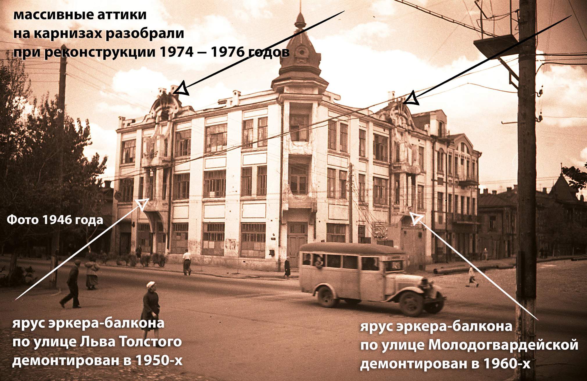 В первоначальном виде фасады по Молодогвардейской (Соборной) и Льва Толстого имели еще по одному ярусу двухэтажных эркеров-балконов, а также по одному массивному фигурному аттику. В 1950 – 1970-х годах они были демонтированы в связи с опасностью обрушения.