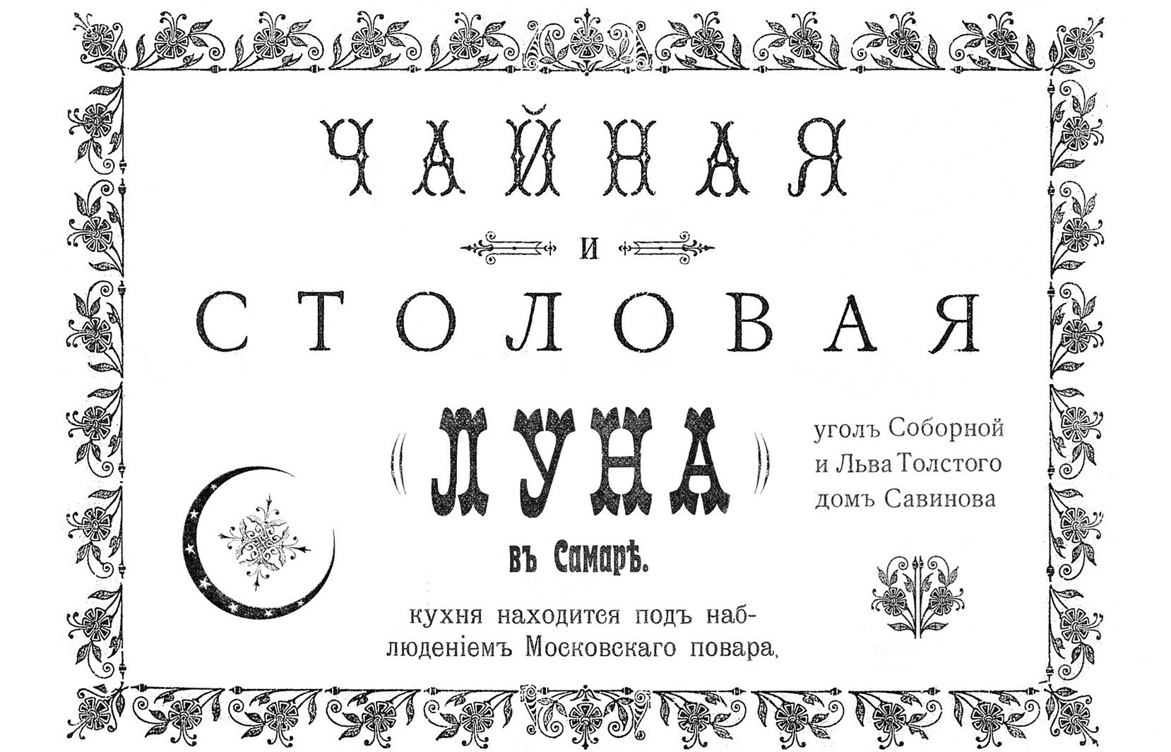Как могла бы выглядеть реклама чайной «Луна». Иллюстрация Павла ПоповаСамара 1917 года. Продовольственный и топливный кризисы, введение карточек на муку и сахар, а затем и продовольственных книжек, инфляция и дороговизна, очереди (как их тогда называли — «хвосты») по всему городу, установление фиксированных цен и безуспешная борьба со спекуляцией, появление дефицита на самые ходовые товары вплоть до одежды и обуви, гигантский поток беженцев, которых негде было размещать, госпитали, переполненные ранеными, участившиеся кражи и грабежи и т.д.