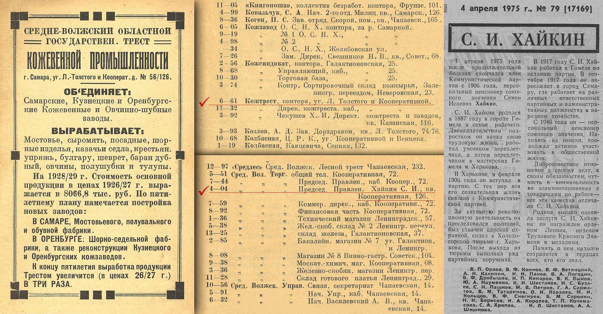 Из всех жителей дома в телефонных справочниках конца 1920-х – середины 1930-х упоминается только один человек – важный функционер в сфере торговли, с 1931 года руководитель Средне-Волжской Краевой конторы гособъединения розничной торговли «ГОРТ», с 1936 года директор Краевой конторы «Куйбышевснабсбыт» в Доме Промышленности, член Крайисполкома Семен Исаевич Хайкин. Наверное, только в его квартире был телефон.