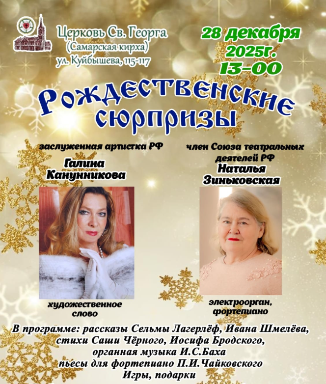 В воскресенье, 28 декабря, в самарской кирхе на улице Куйбышева, 115/117 состоится концерт «Рождественские сюрпризы».