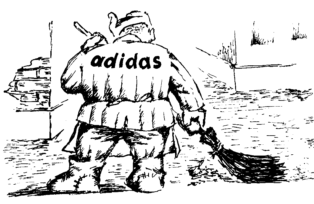 Сначала карандашом делаются непонятные штрихи. Ничего не понять. Еще штрихи. Глядь, а там дворник с метлой и в фуфайке, на которой написано «adidas».