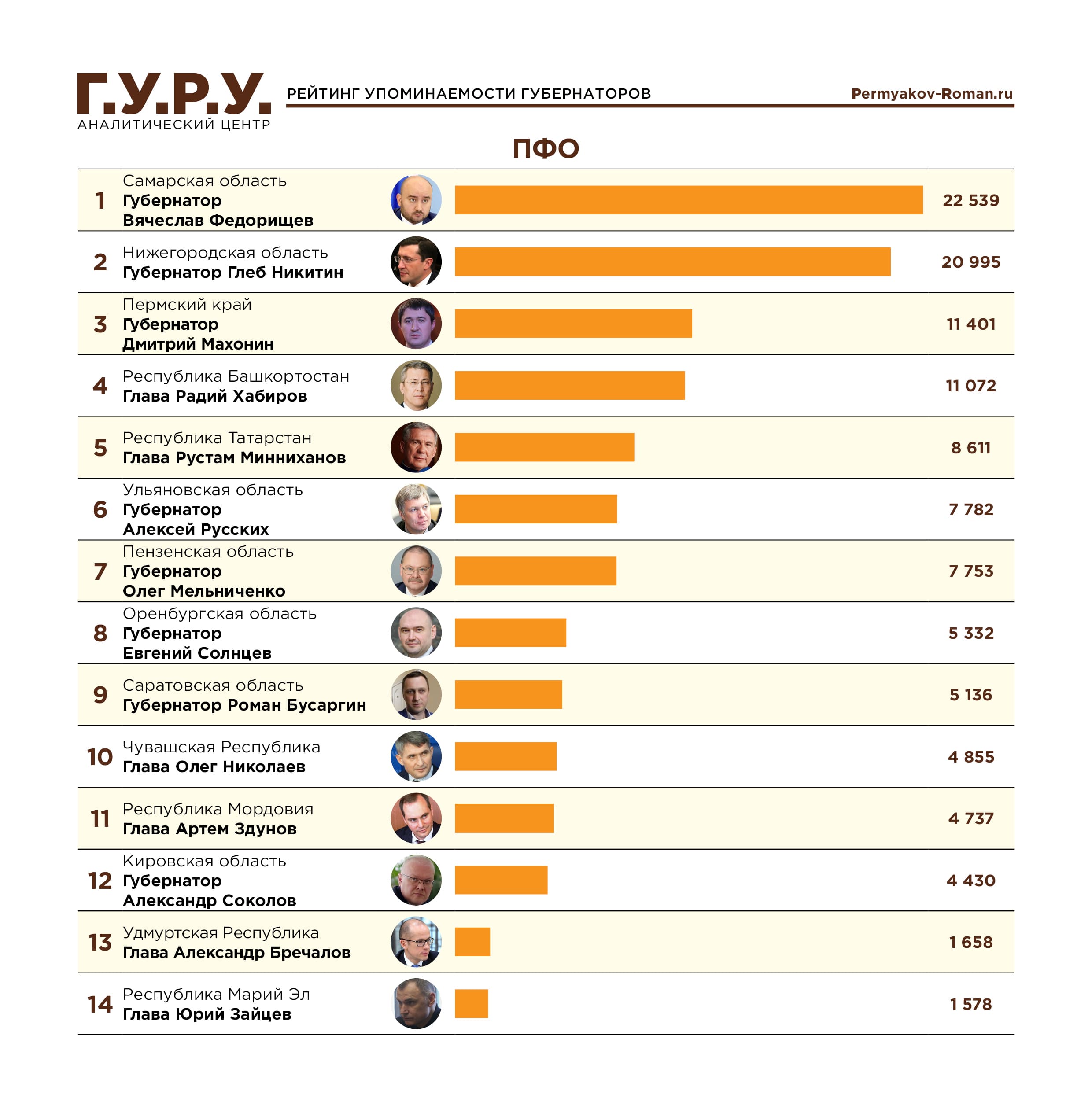 Аналитический центр «Г.У.Р.У.» презентовал рейтинг упоминаемости губернаторов ПФО за ноябрь 2025 года.