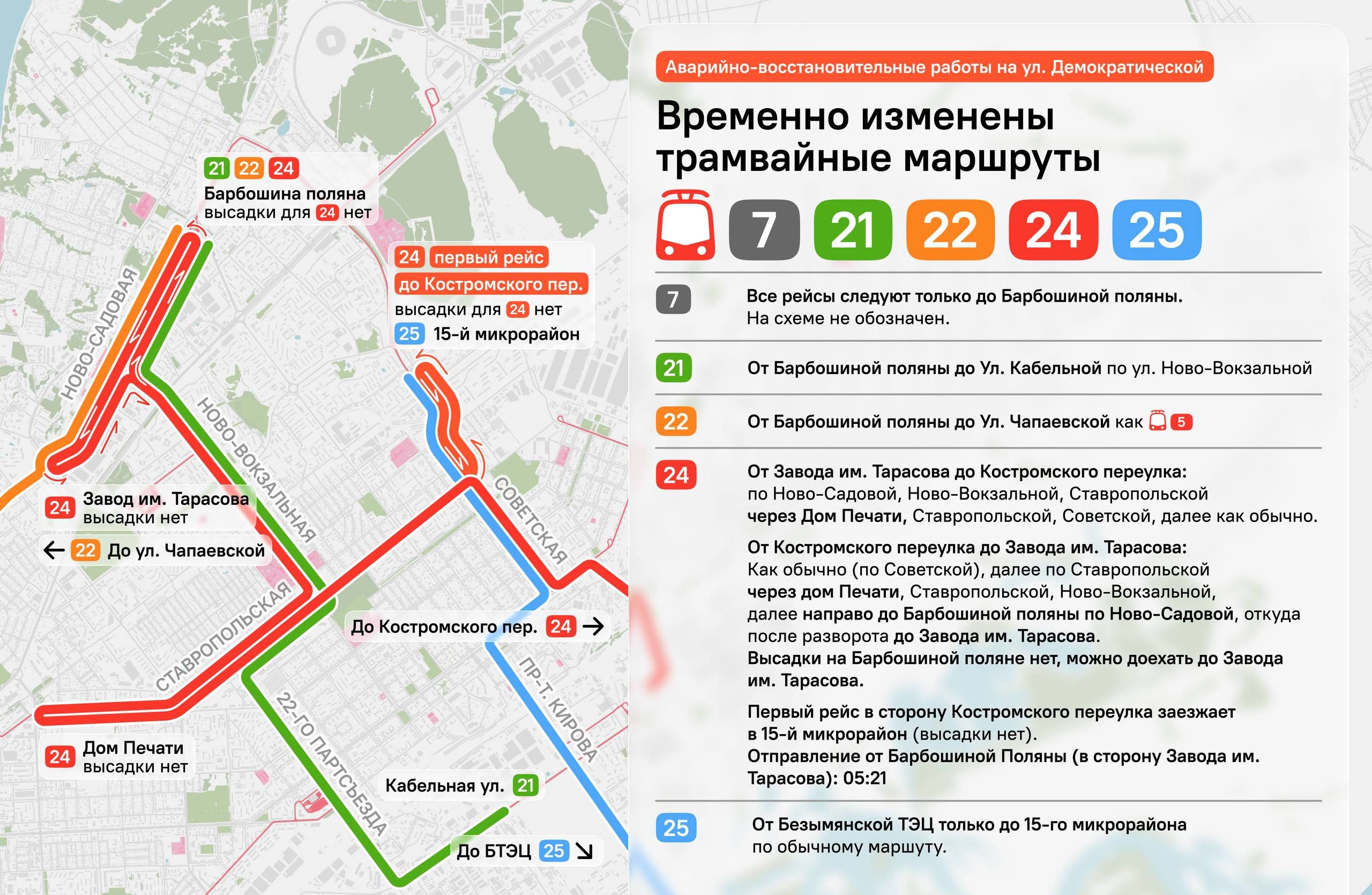 Из-за аварийно-восстановительных работ закрыто движение трамваев на по улицам Демократической, Ташкентской от проспекта Кирова до 15 микрорайона в оба направления. Временно не работают 10 остановок.