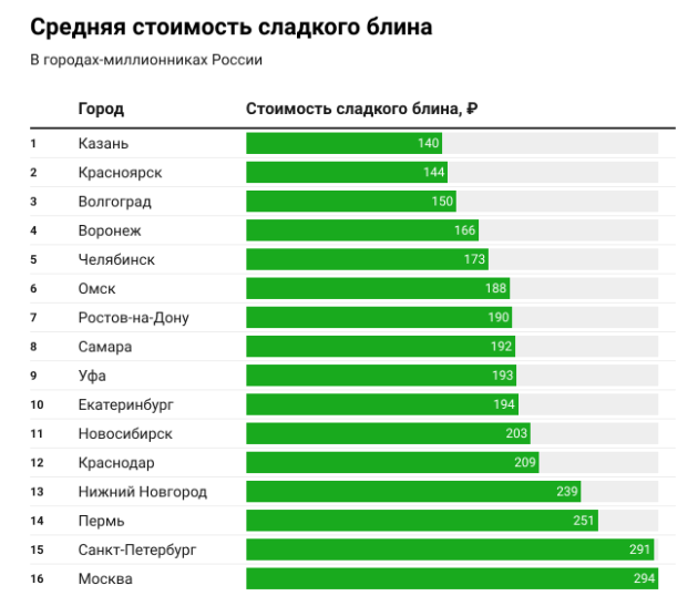 Самые доступные сладкие блины — в Казани (140 рублей), Красноярске (144 рубля) и Волгограде (150 рублей).