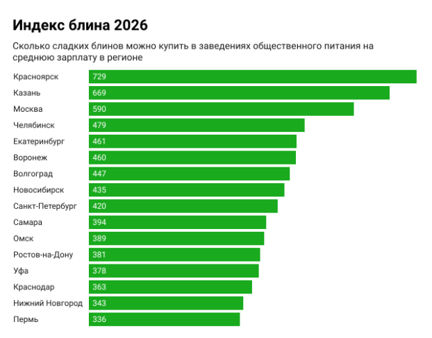 Лидером рейтинга стал Красноярск — здесь на среднюю зарплату можно купить 729 сладких блинов. В тройке также Казань (669 блинов) и Москва (590). Меньше всего индекс в Перми (336), Нижнем Новгороде (343) и Краснодаре (363).