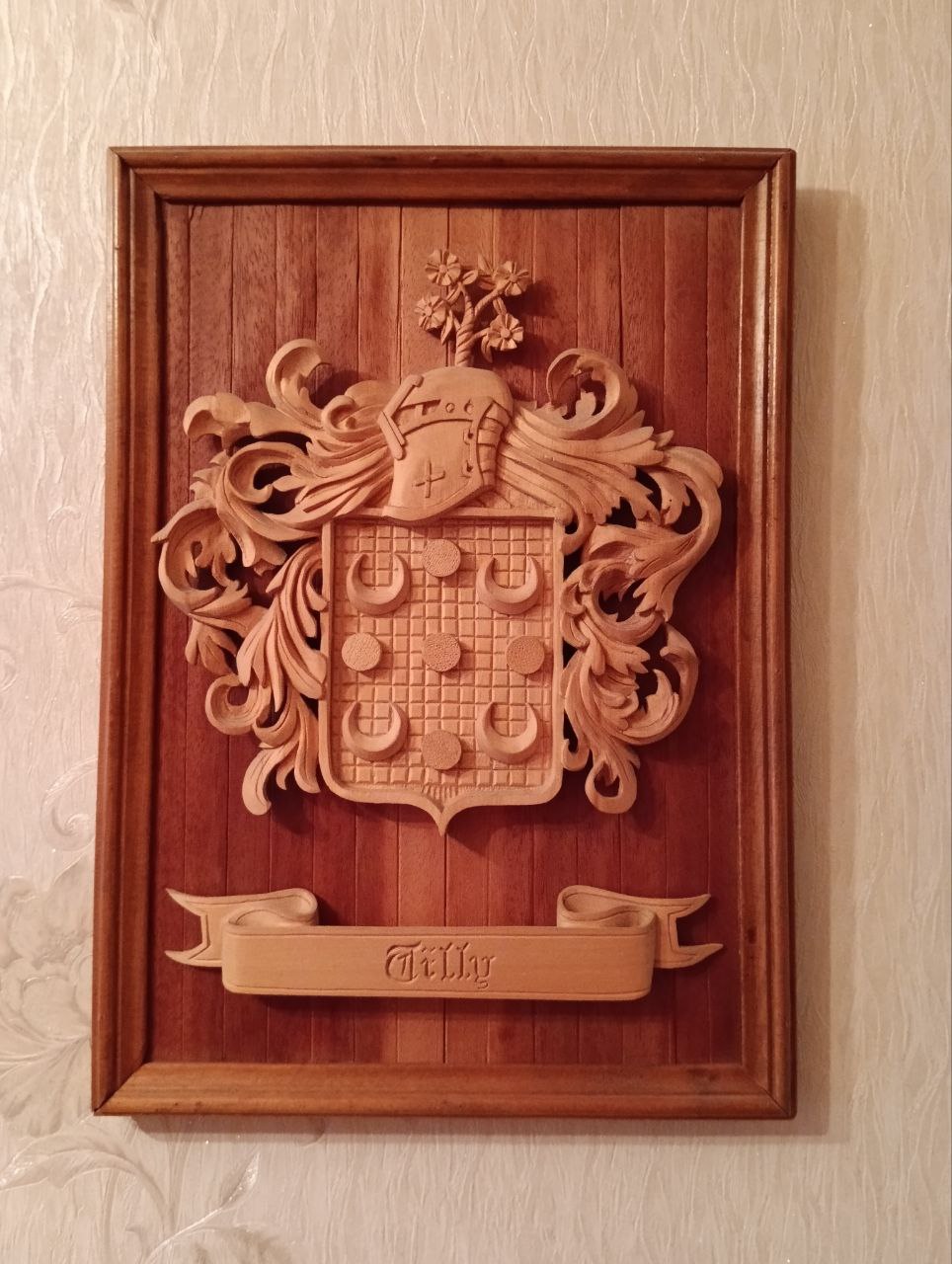 «Вот наш родовой герб, — показывает Александр Тилли, — я в 1990-е годы делал запрос в Германию в специализированный фамильный центр, получил изображение средневекового фамильного герба и реализовал его в дереве».
