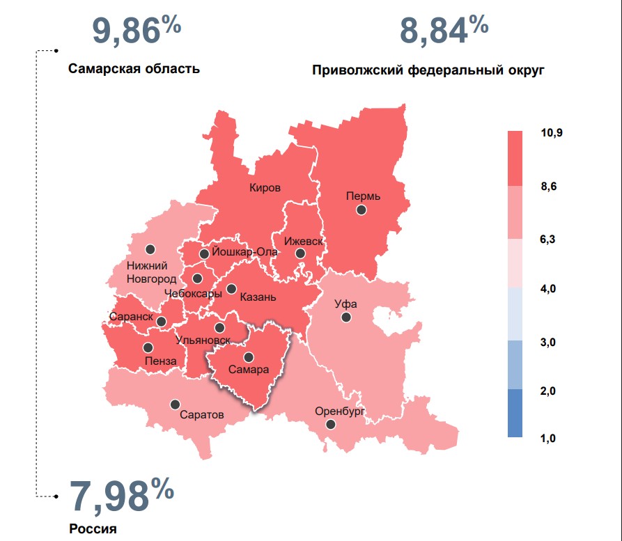 В целом годовая инфляция в Самарской области составила 9,86%. Это почти на 2 процентных пункта выше, чем в целом по стране (7,98%) и выше, чем в среднем по Приволжскому федеральному округу (8,84%).
