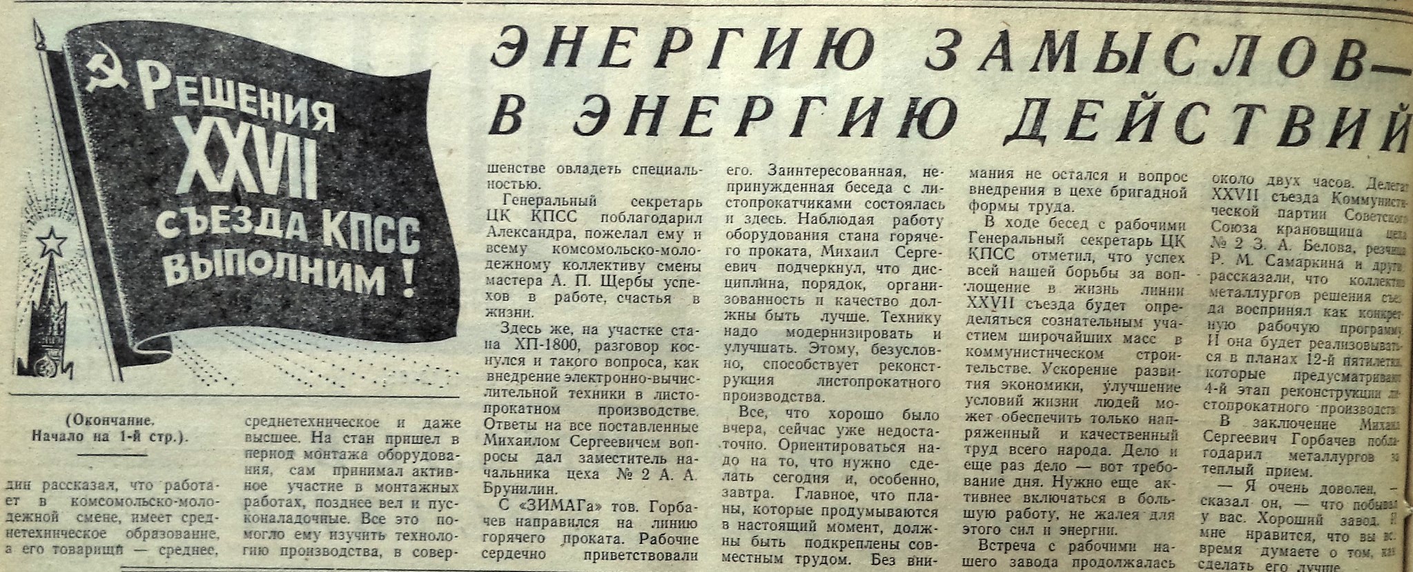 Газета «За советский станок». 14 апреля 1986 года.Но, вернемся в 9 апреля 1986 года. Вторым предприятием, которое посетил Михаил Сергеевич в тот день, стало швейное производственное объединение «Красная Звезда».