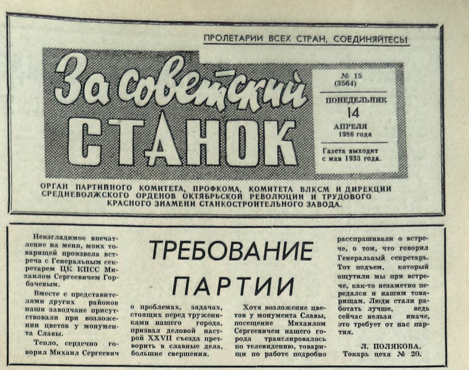 Газета «Волжская коммуна» за 9 апреля 1986 года сообщала: