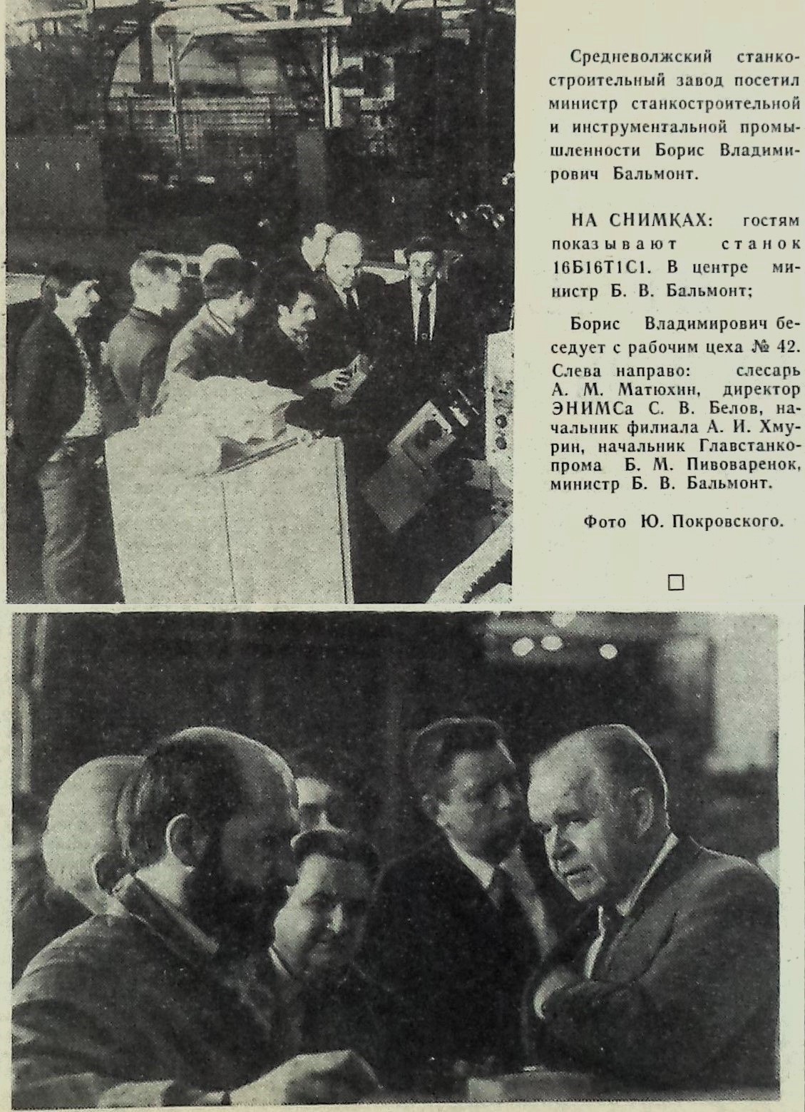 Заметим, что спустя пару дней после отъезда Михаила Сергеевича куйбышевских станкостроителей посетил еще один высокий гость — профильный министр Борис Бальмонт. Внучатый племянник знаменитого поэта-символиста.