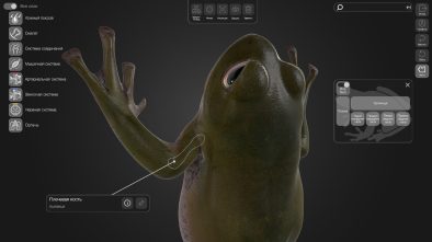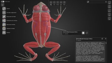 Как и в других атласах комплекта, в 3D-модели лягушки детально проработаны все основные анатомические системы: скелет, мышечная система, нервная система, пищеварительная, дыхательная и кровеносная системы.