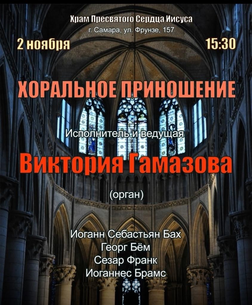 В воскресенье, 2 ноября, в Храме Пресвятого Сердца Иисуса на улице Фрунзе, 157 состоится концерт «Хоральное приношение».
