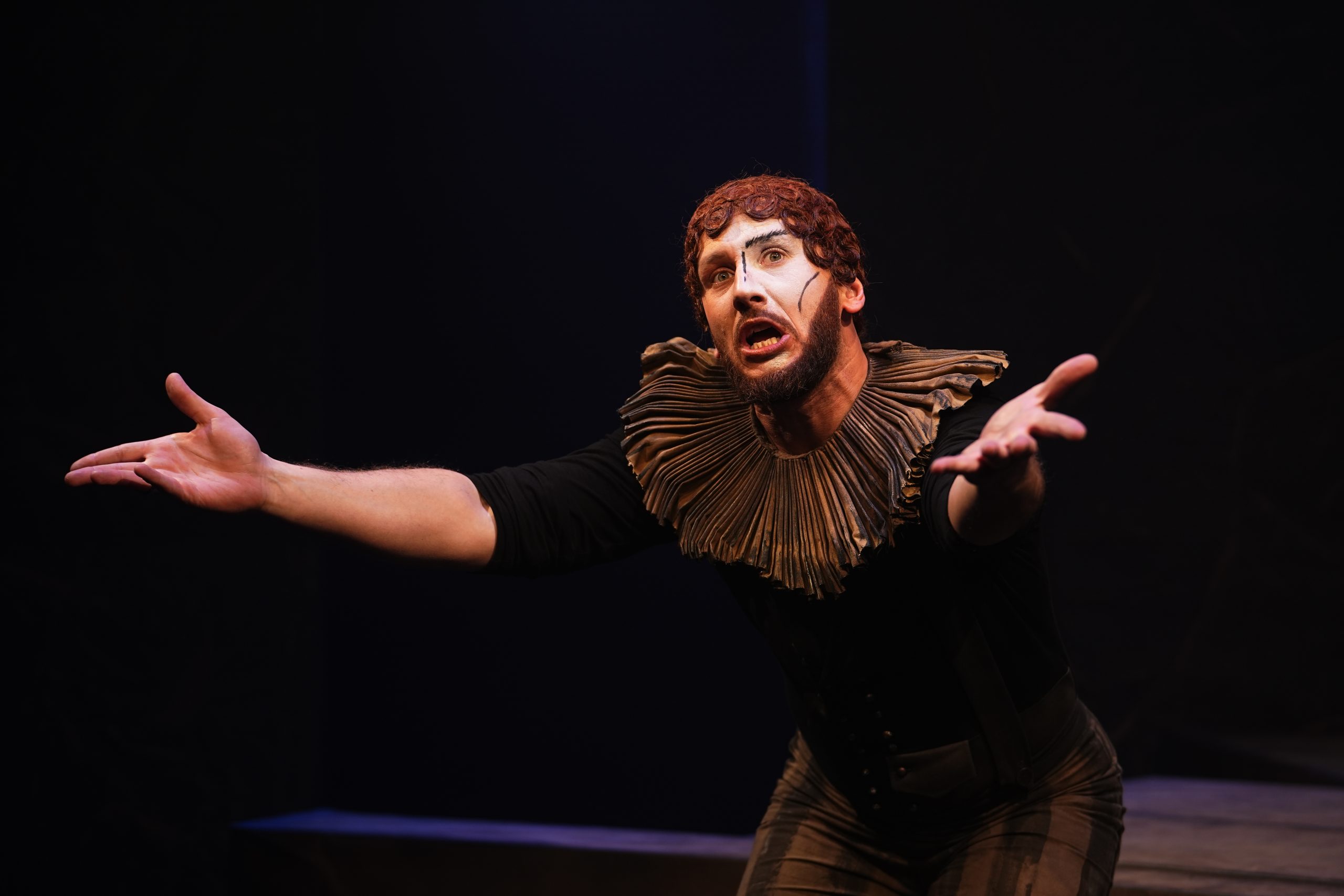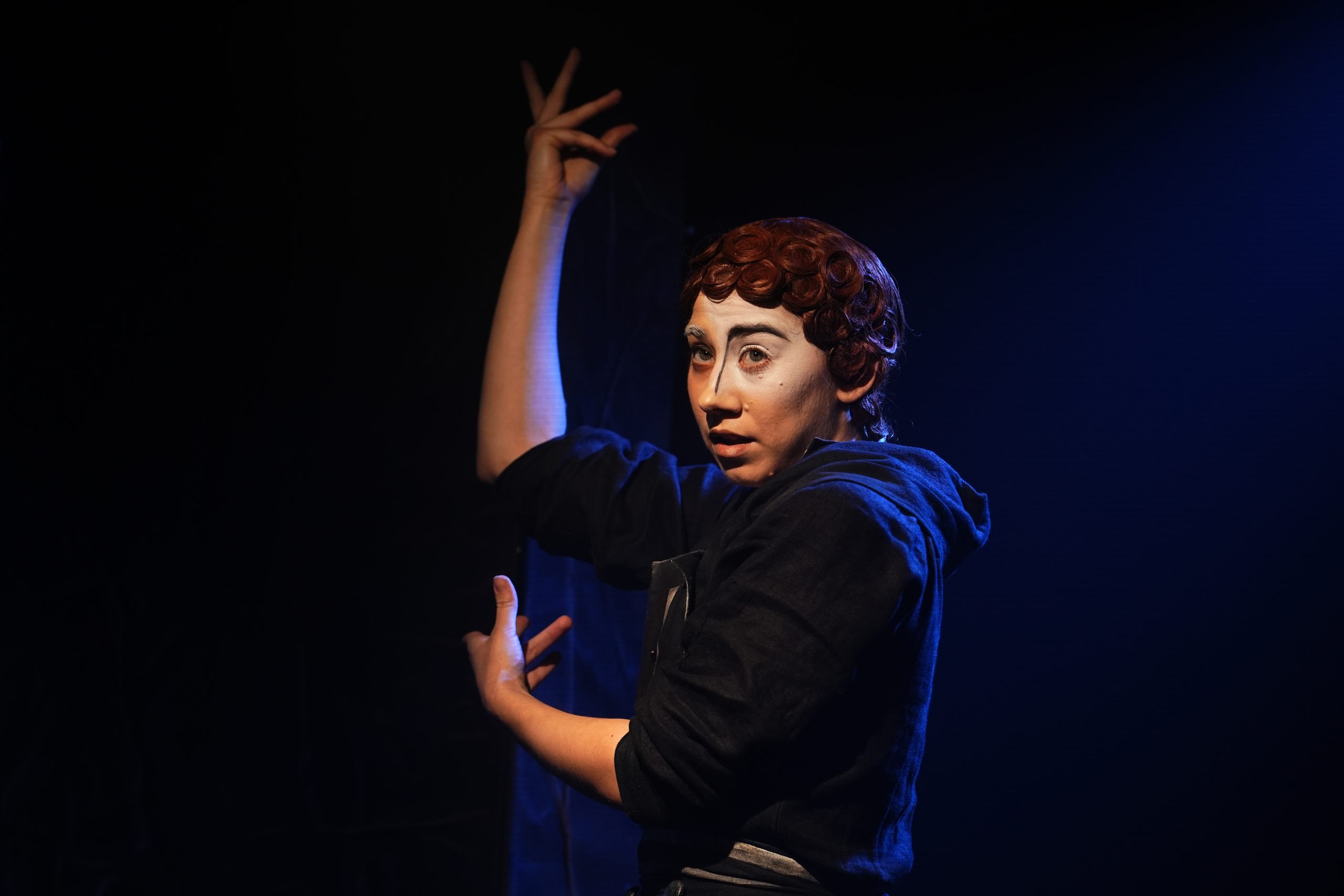 Их костюмы условны и сотканы как будто из деталей разных эпох, их грим напоминает маски и греческого театра, и комедии дель арте, и площадного русского народного театра.