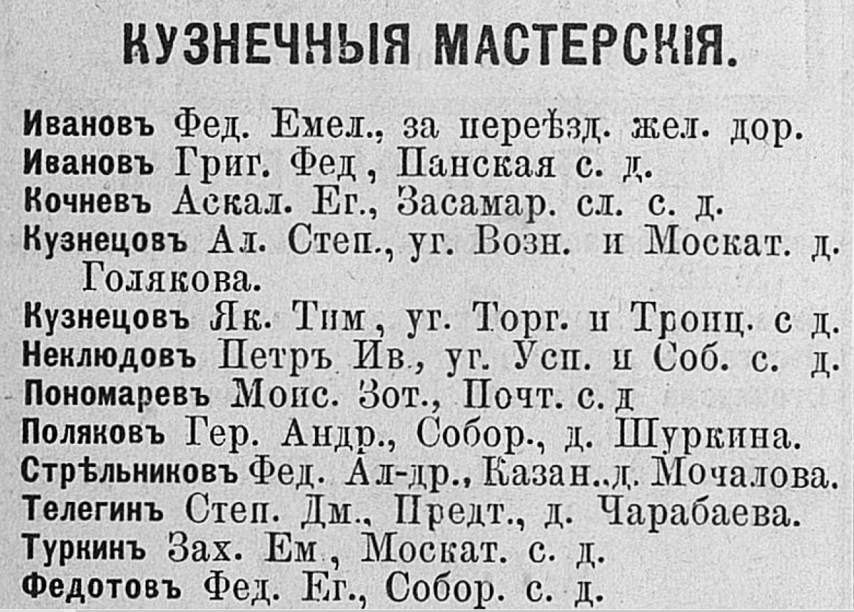 В адрес-календаре 1900 года указаны 12 кузнечных мастерских в Самаре. География была достаточно широка.