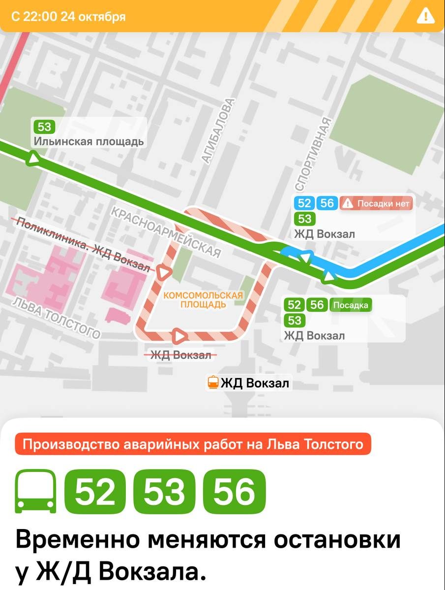 — маршруты №№ 52, 56 – по направлению от железнодорожного вокзала автобусы будут ходить от остановки «Железнодорожный вокзал» по улице Красноармейской; обратно – без изменений.