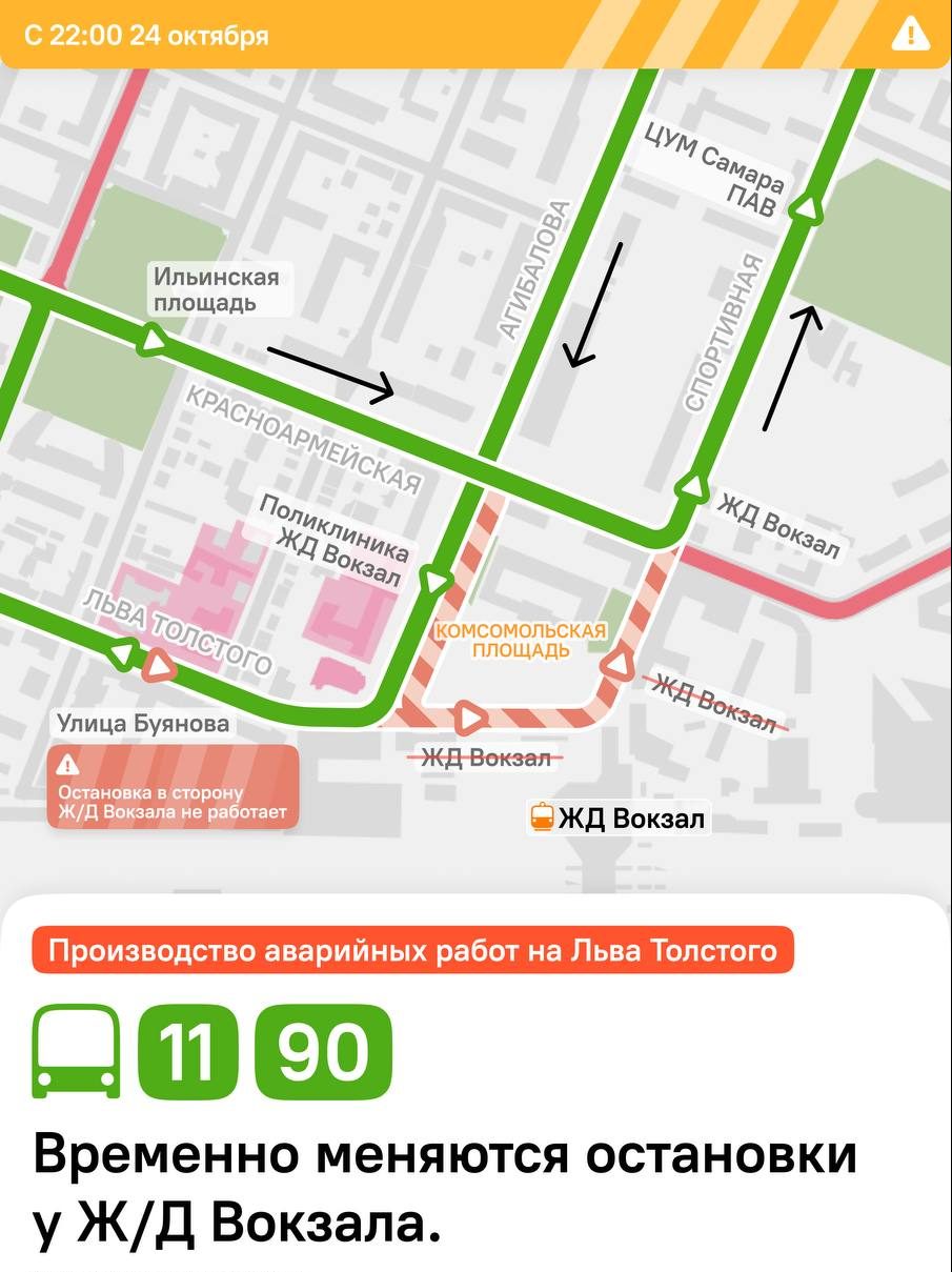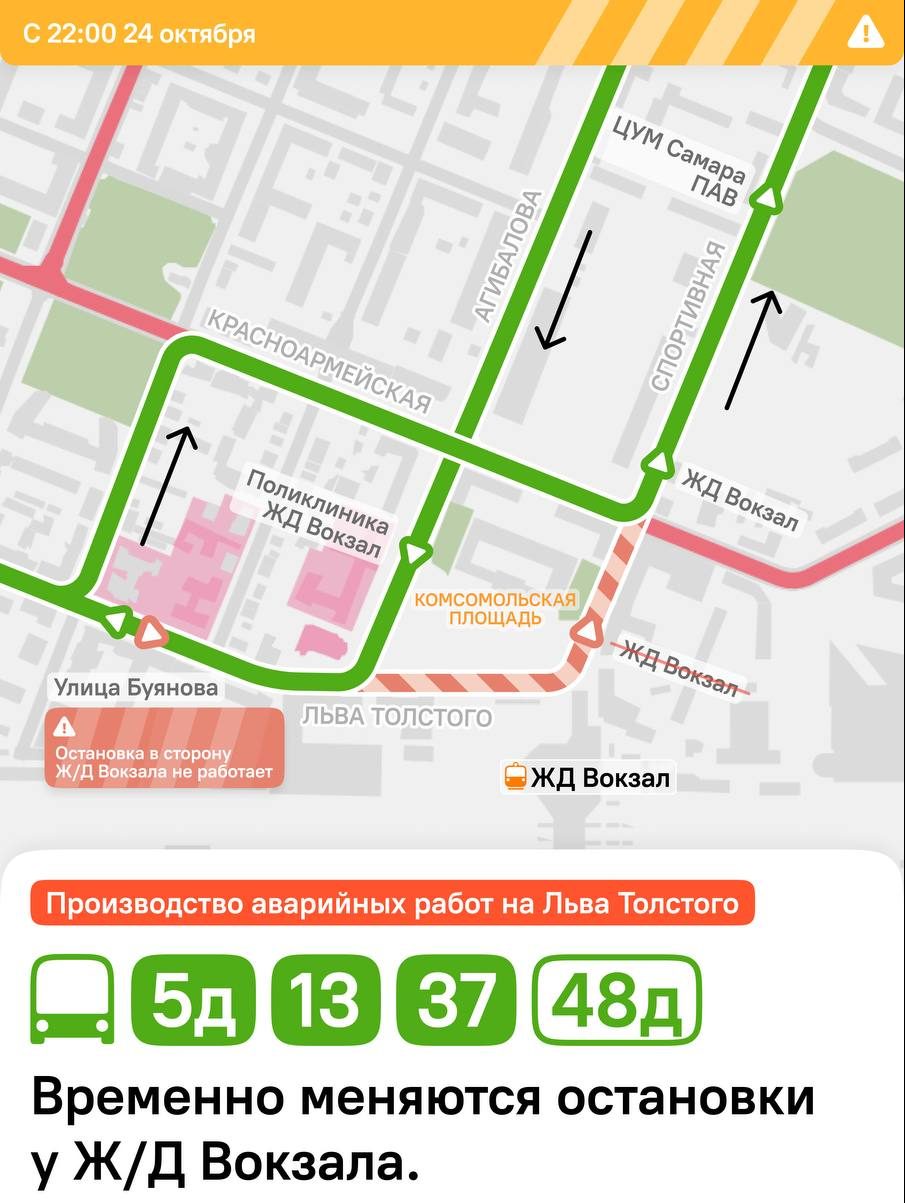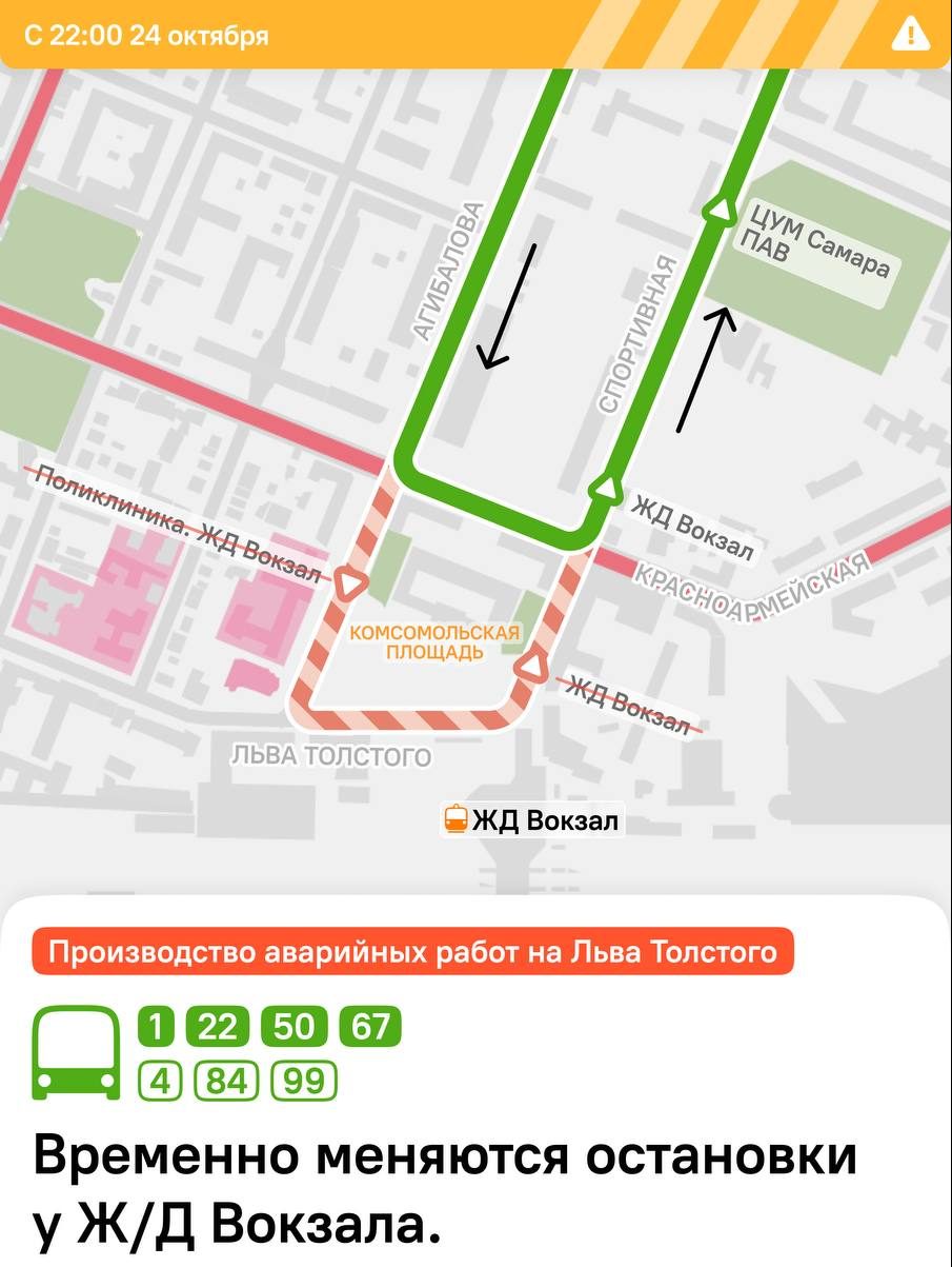 — маршруты №№ 1, 22, 50, 67, 4, 84, 99 – в направлении железнодорожного вокзала будут ходить до остановки «ЦУМ «Самара» – Пригородный автовокзал»; в обратном направлении – от остановки «Железнодорожный вокзал» по улице Спортивной, после пересечения с улицей Красноармейской;