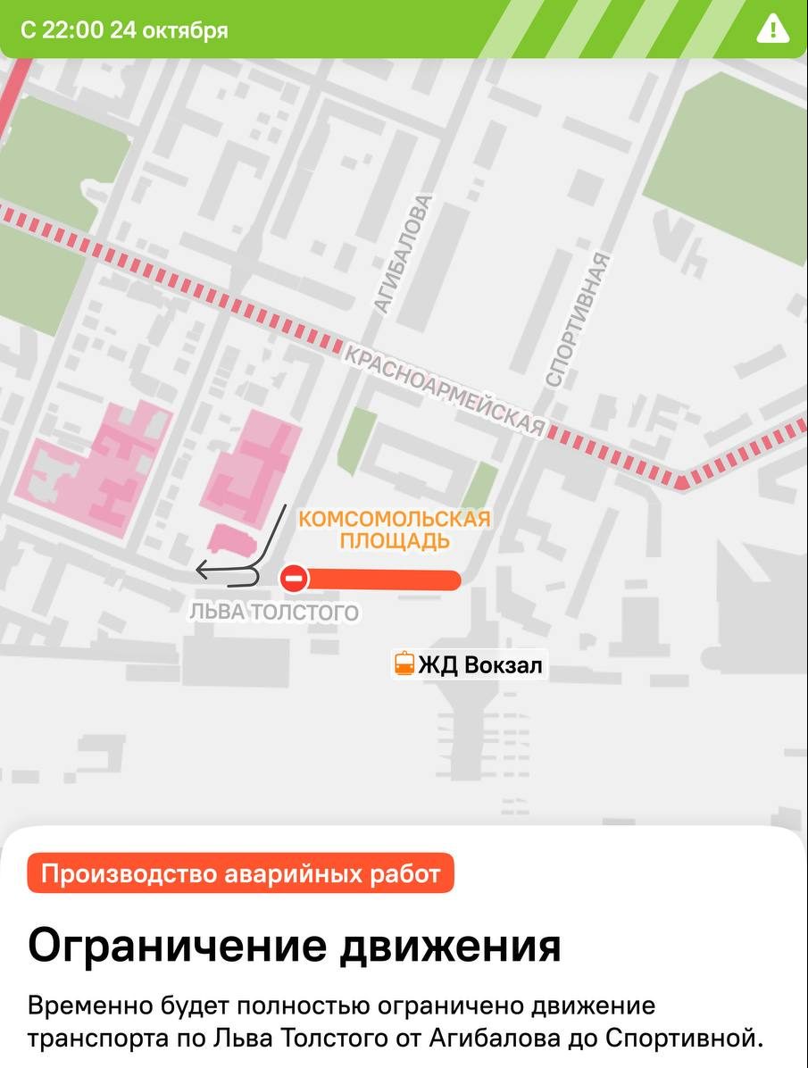 Участок улицы Льва Толстого от улицы Агибалова до Спортивной закрыт для движения транспорта ориентировочно до конца суток 26 октября.