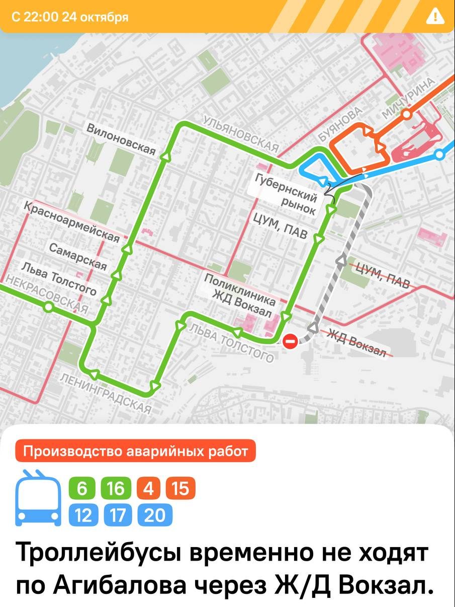 — маршрут № 11 – в сторону Губернского рынка – по улице Красноармейской до Спортивной, далее по своему маршруту; в обратном направлении – по обычной трассе следования;