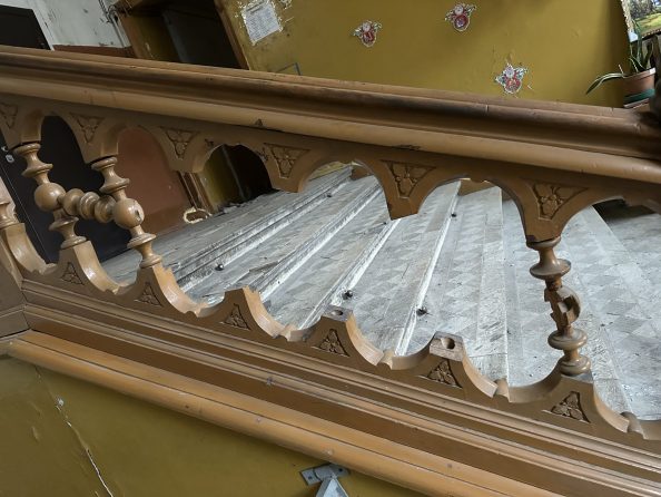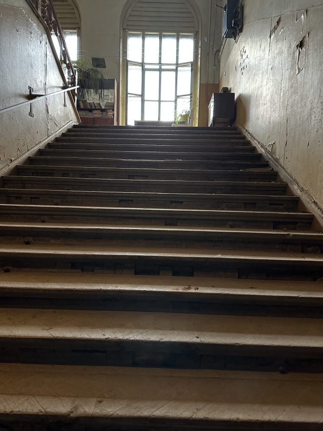 Мы не заходим в дом с улицы — сейчас парадная дверь заколочена. В дом можно попасть через боковой вход. И сразу перед тобой открывается широкая лестница с паркетной отделкой — редчайший пример бытовой столярной роскоши.