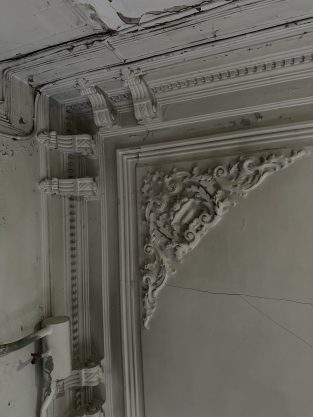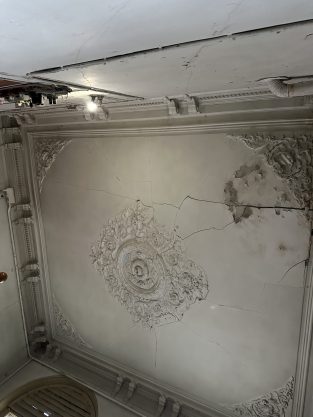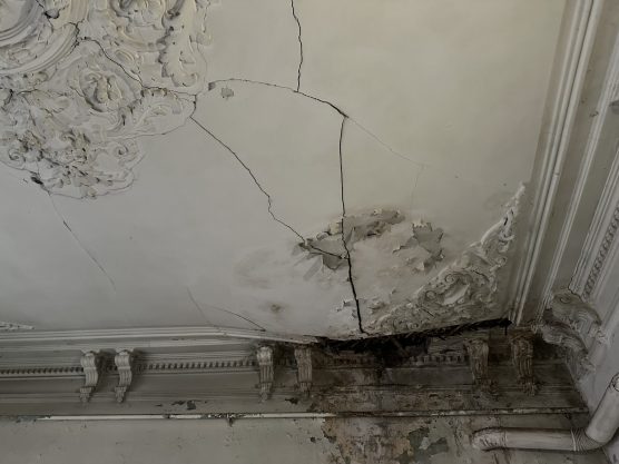 Но восхищенный вздох сразу прерывается, стоит поднять взгляд вверх. Богатая лепнина потолка, кажется, готова хоть сейчас сорваться вниз. Заметно, как над ней выгнулись прогнившие балки подкрышного перекрытия.