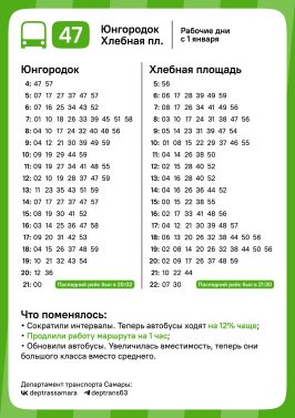 Автобусы маршрута № 47, который курсирует между Юнгородком и Хлебной площадью, будут ходить чаще и работать на один час дольше.