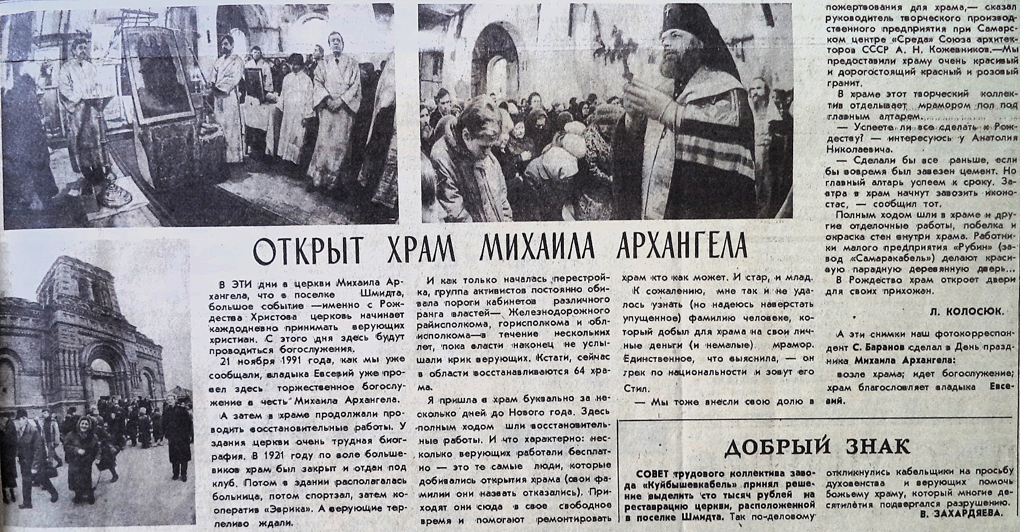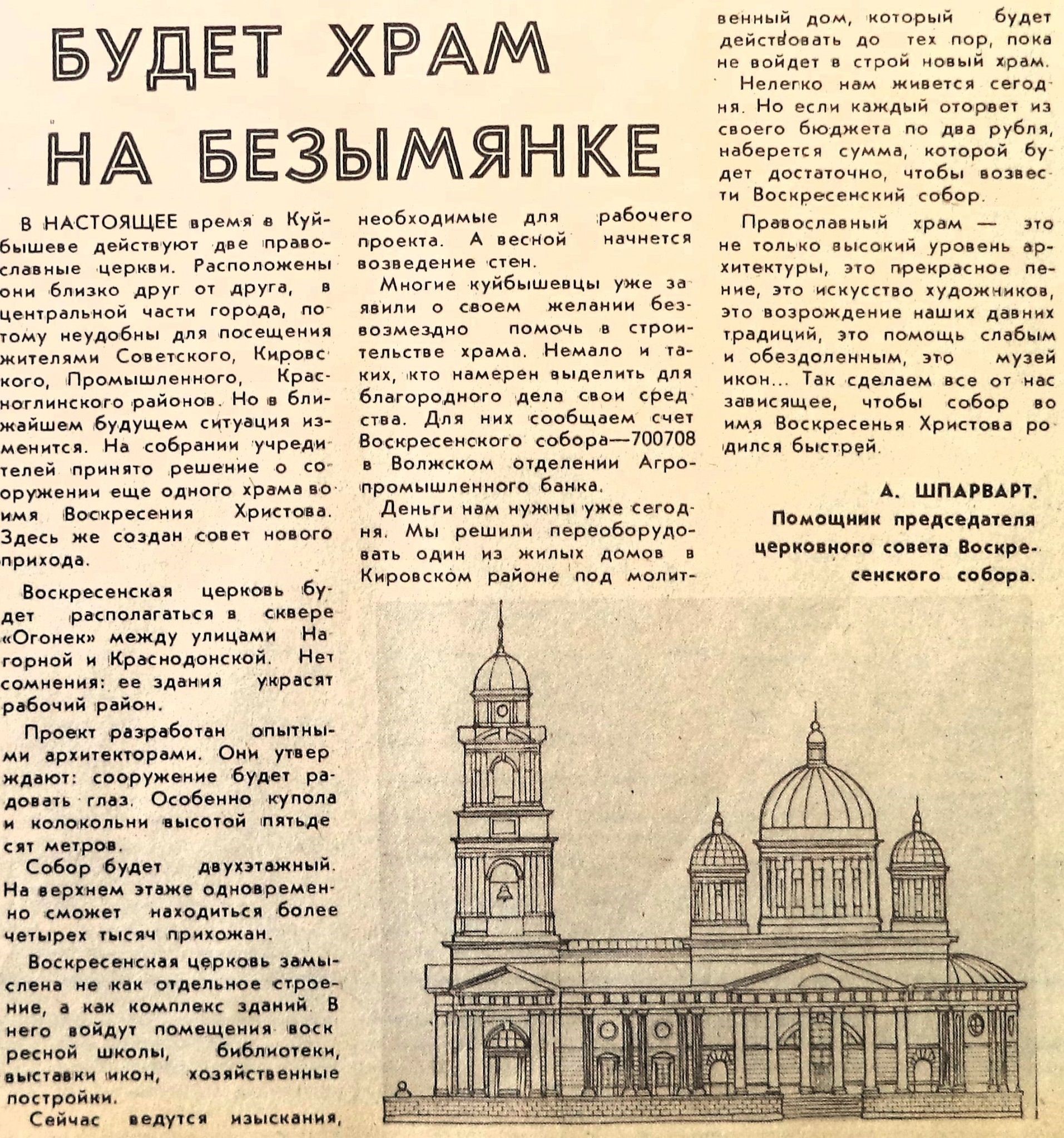 Располагались они в историческом центре города. Но своего храма ждали и жители рабочей Безымянки. Об этом можно прочесть в статье газеты «Волжская заря» от 7 ноября 1990 года.